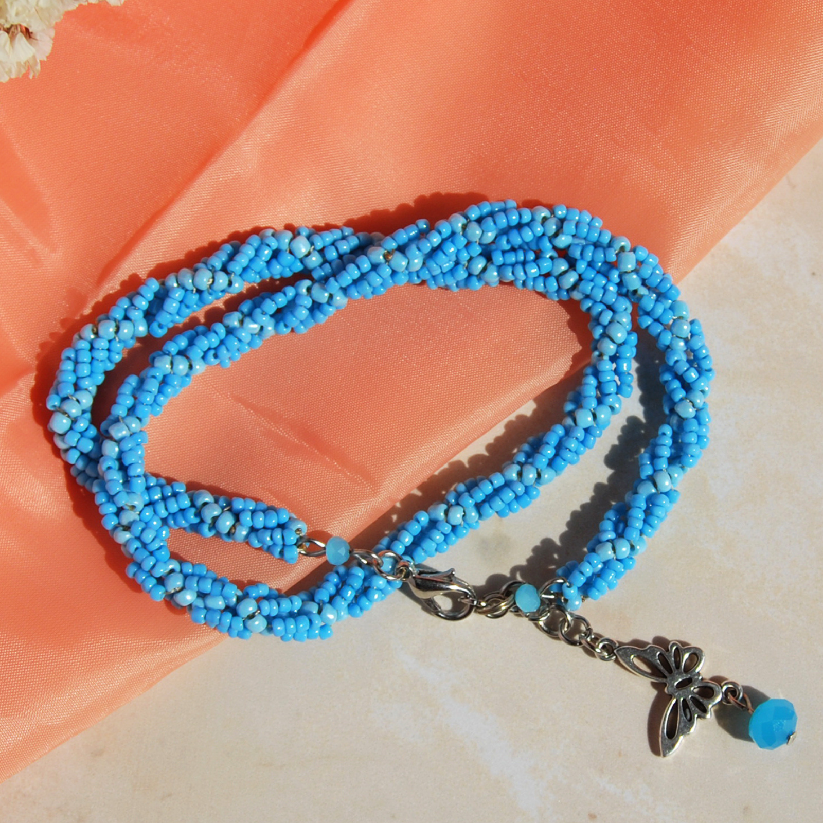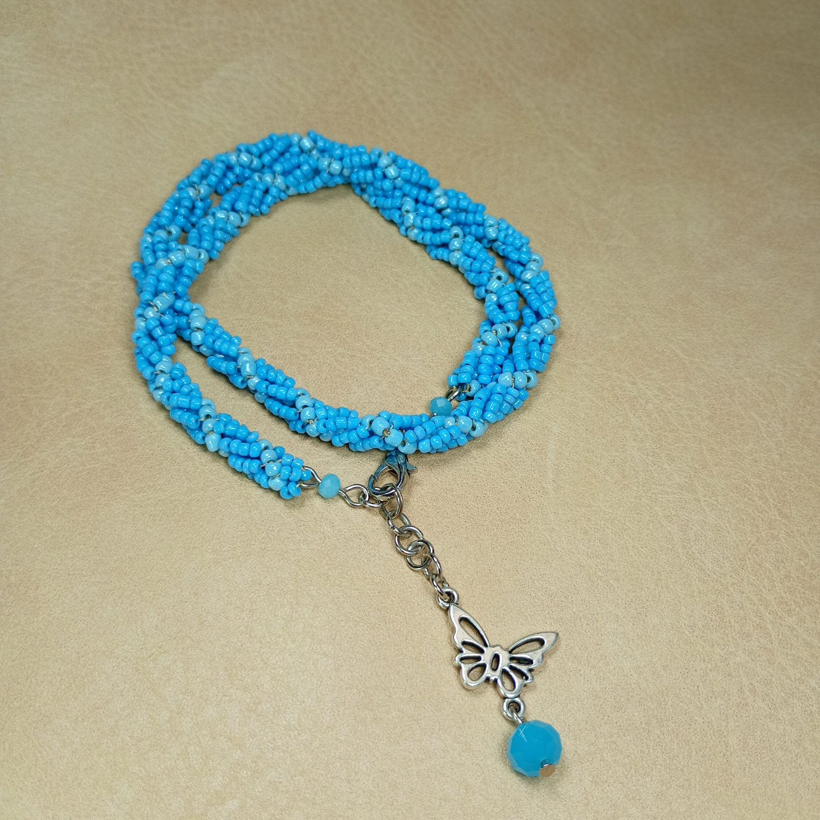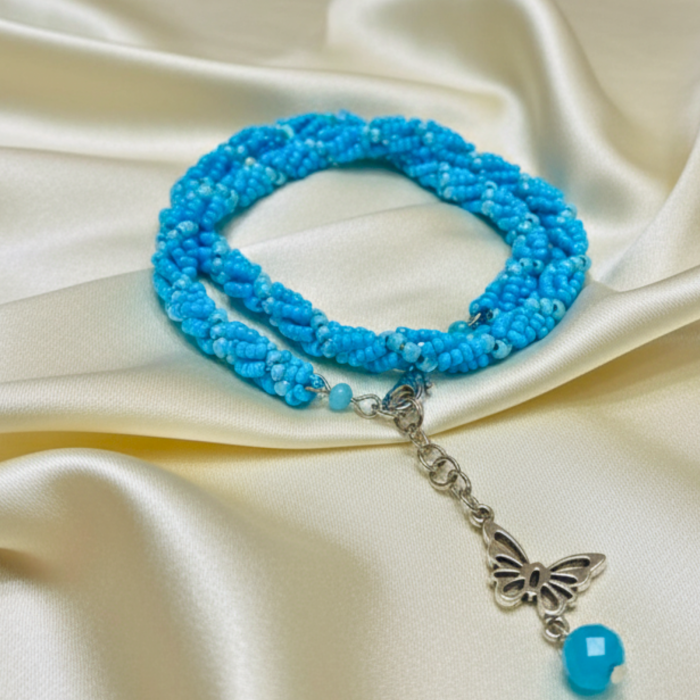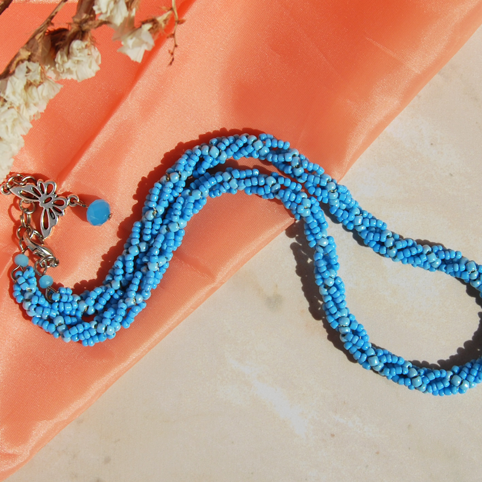 Descoperă frumusețea simplă și calmul cerului senin într-o bijuterie handmade. Colierul Albastru Senin este realizat manual din mărgele fine de sticlă cusute cu grijă