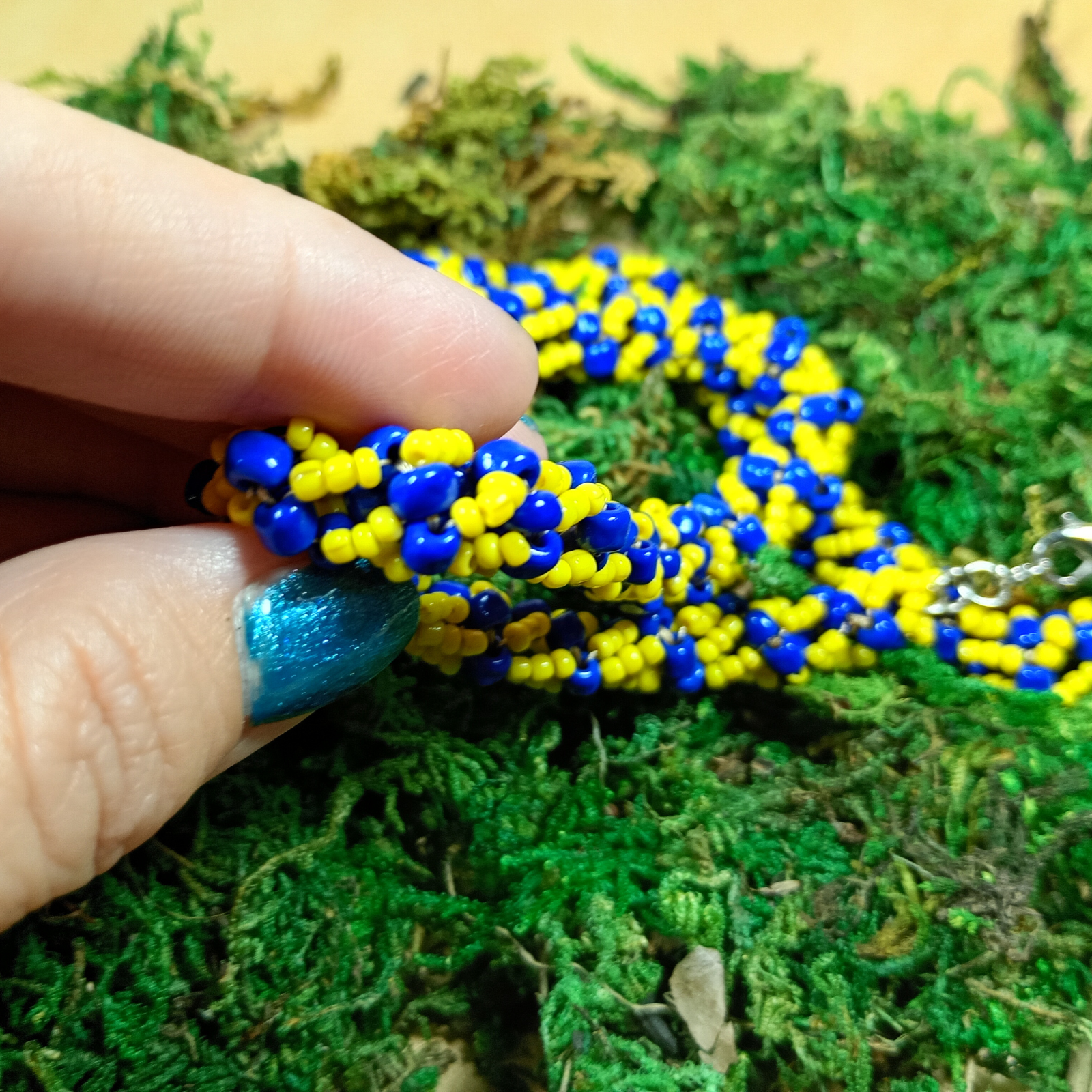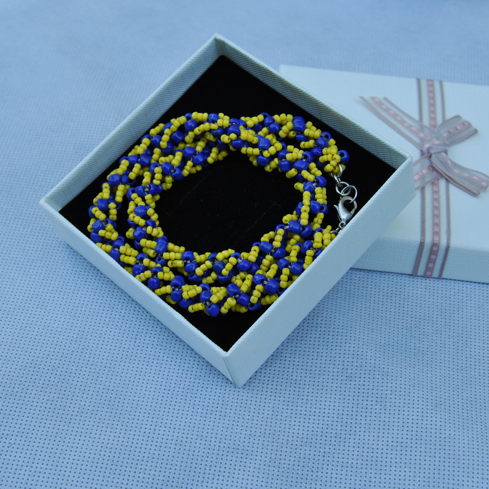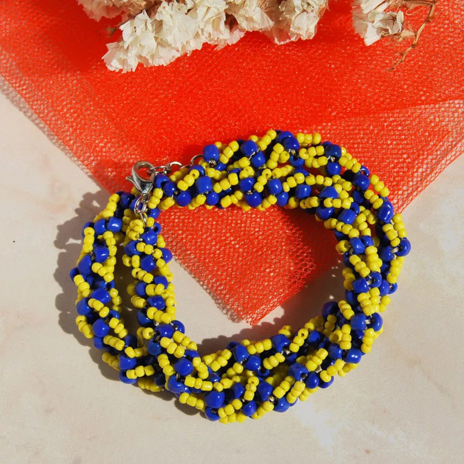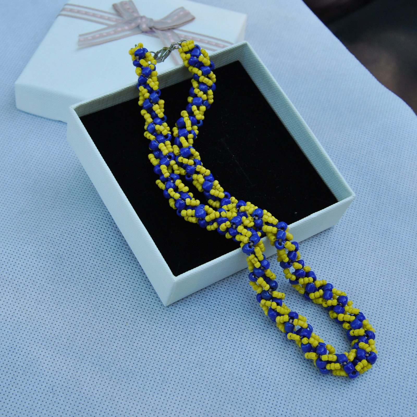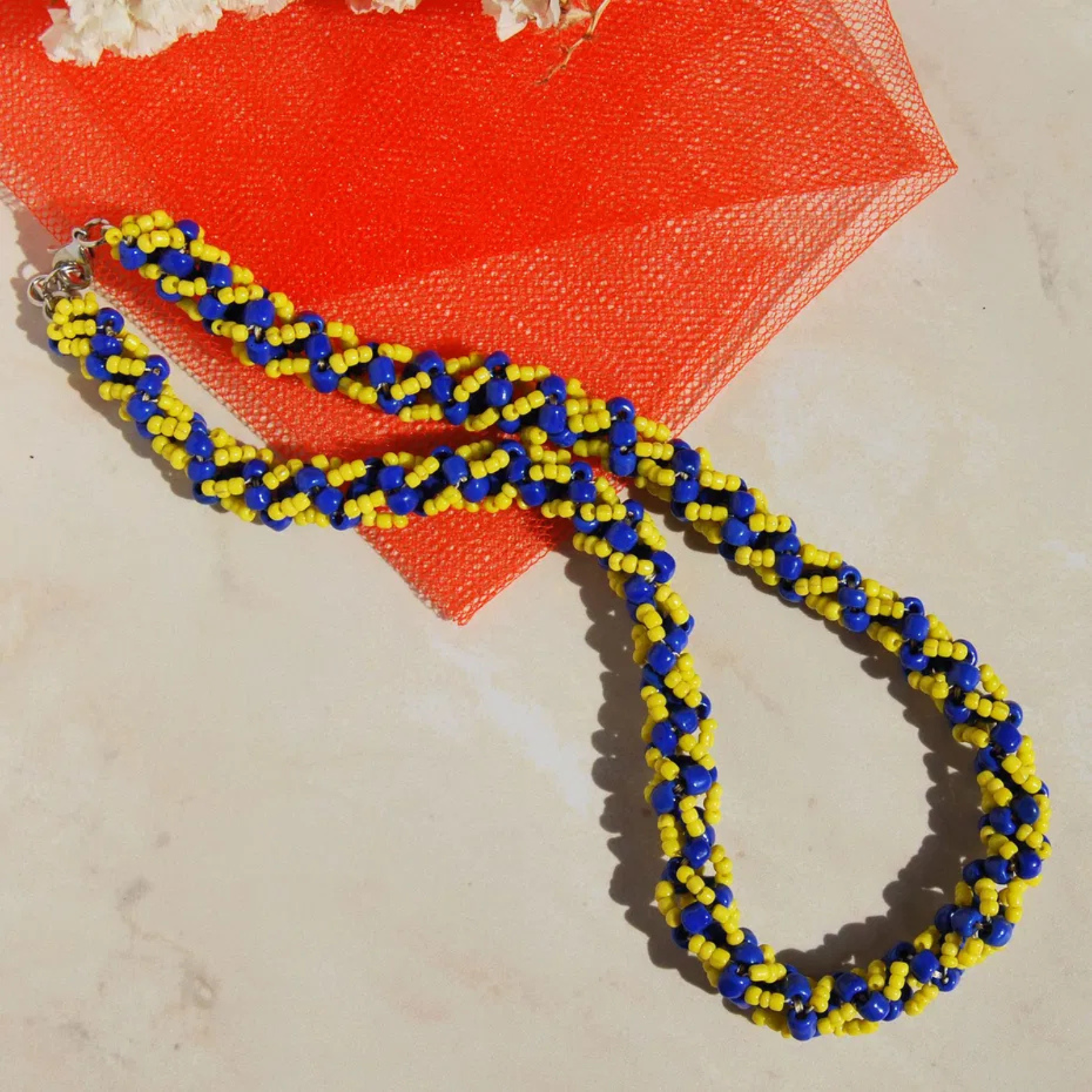Acest colier handmade este realizat printr-o tehnică minuțioasă de cusut în spirală, folosind mărgele de sticlă galbene și albastre de diferite dimensiuni. Fiecare detaliu este cusut manual cu grijă, formând un model elegant și vibrant, inspirat de energia soarelui și liniștea mării.