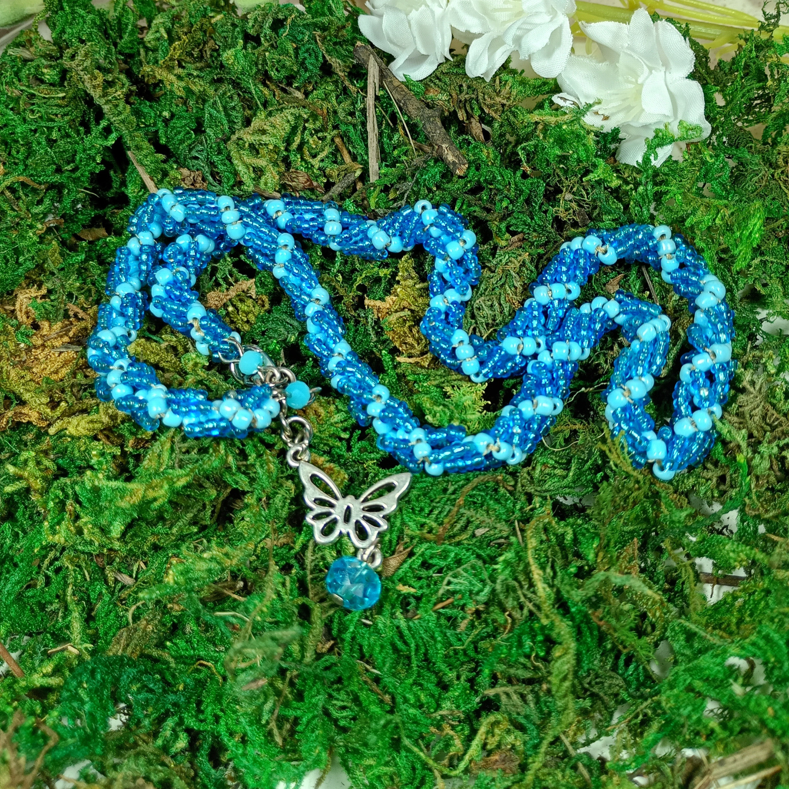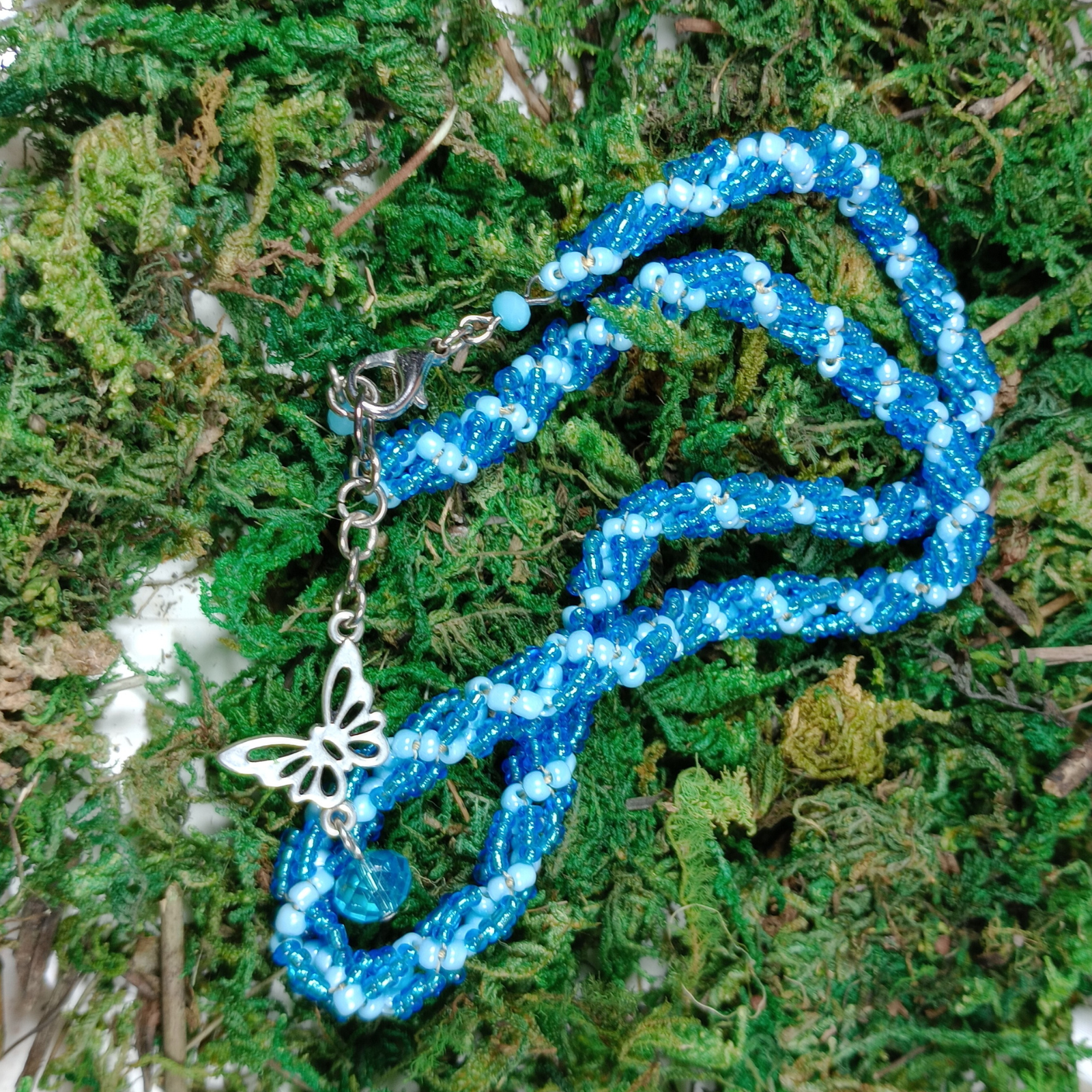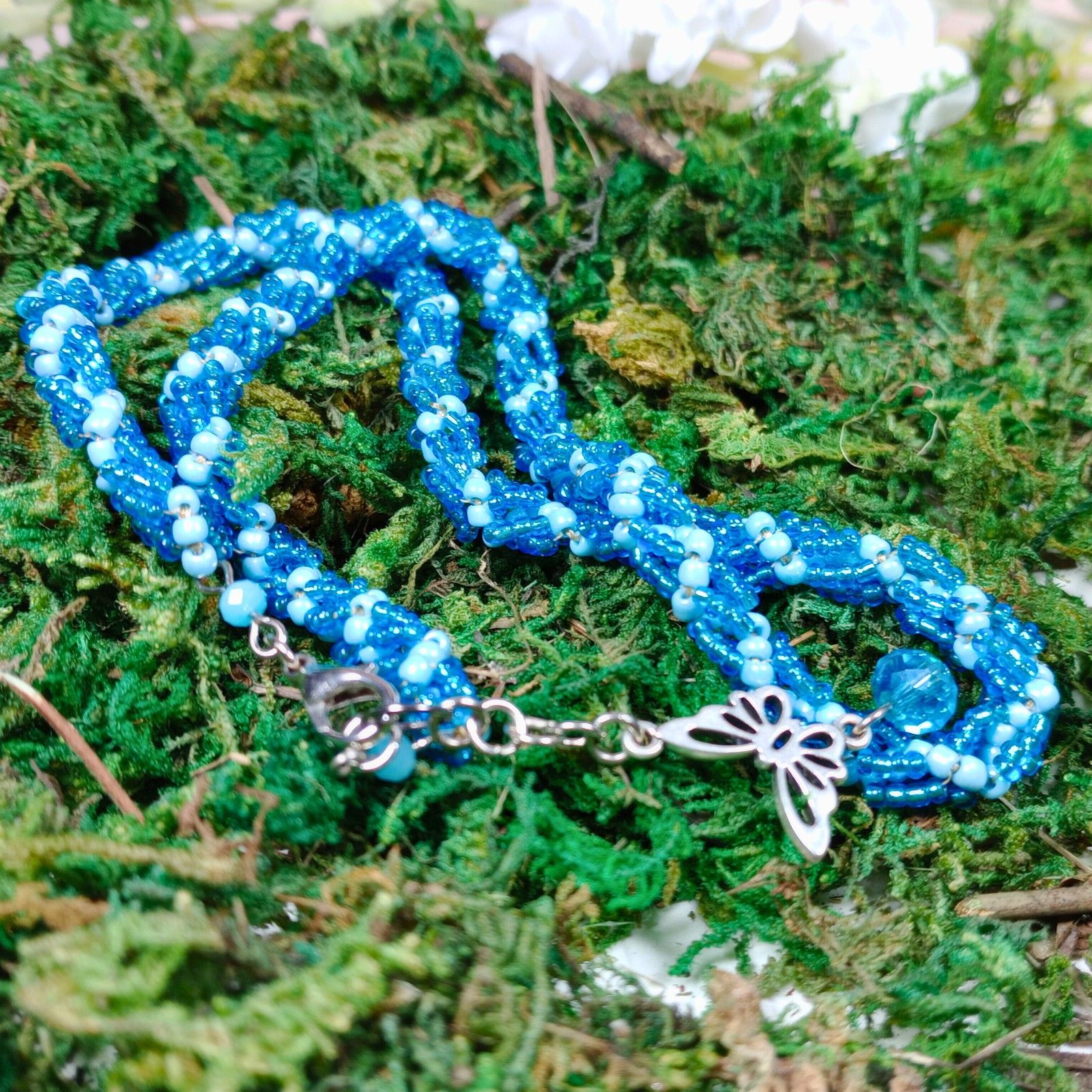 Colier Spirala Albastră, lucrat manual din margele sticla, cu detalii din metal si cristal.