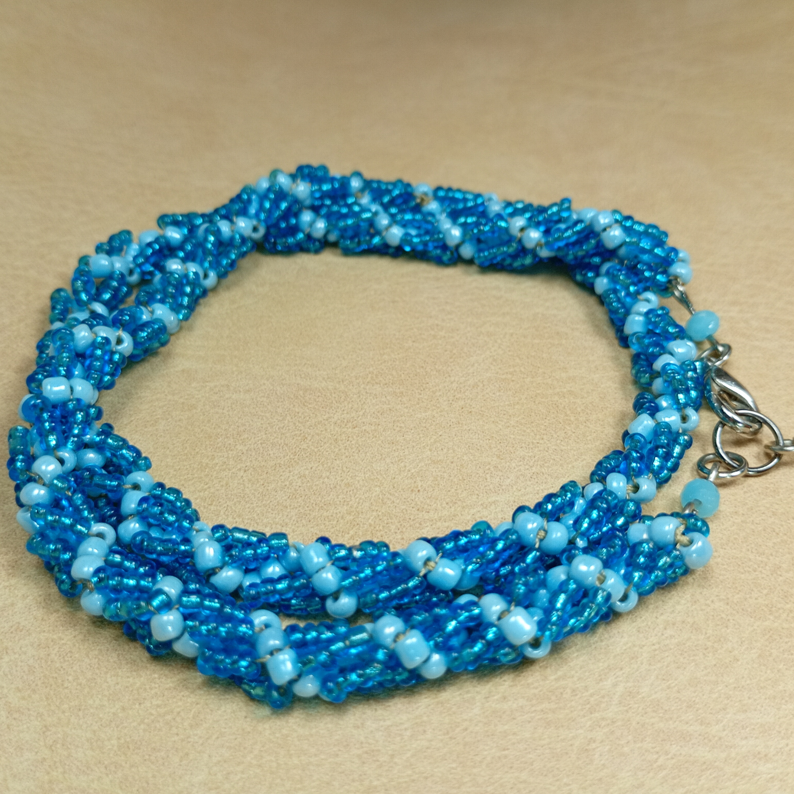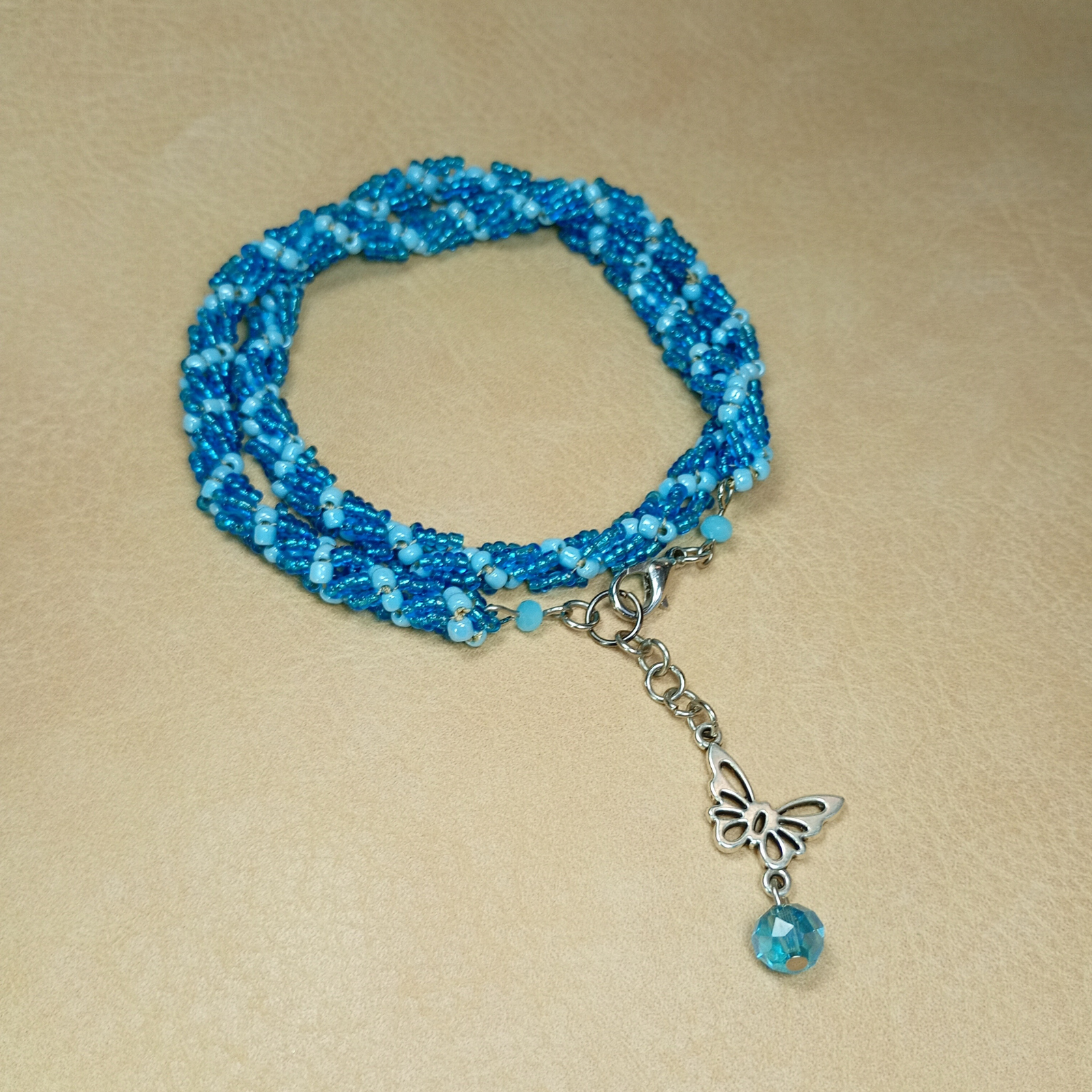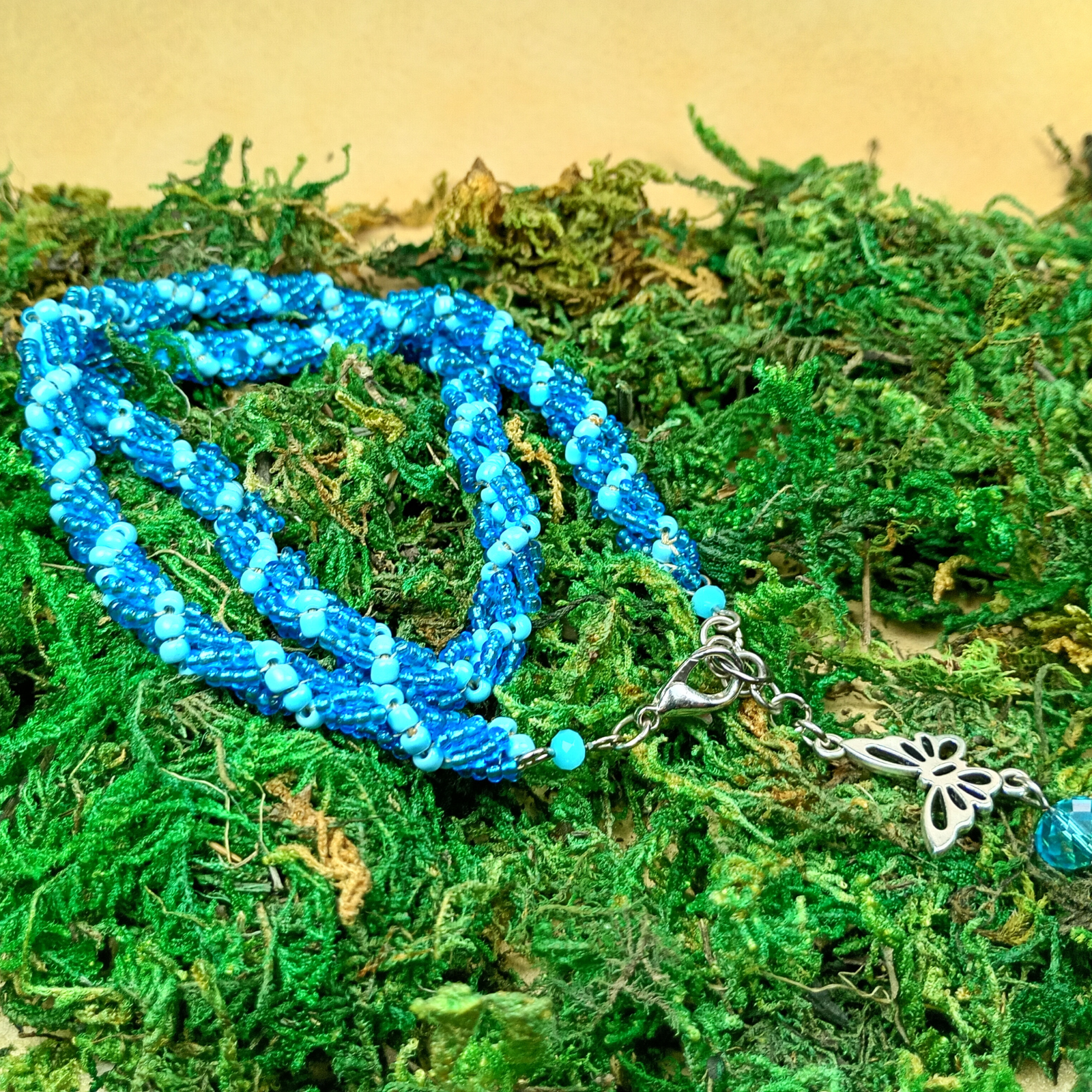Colier Spirala Albastră, lucrat manual din margele sticla, cu detalii din metal si cristal.