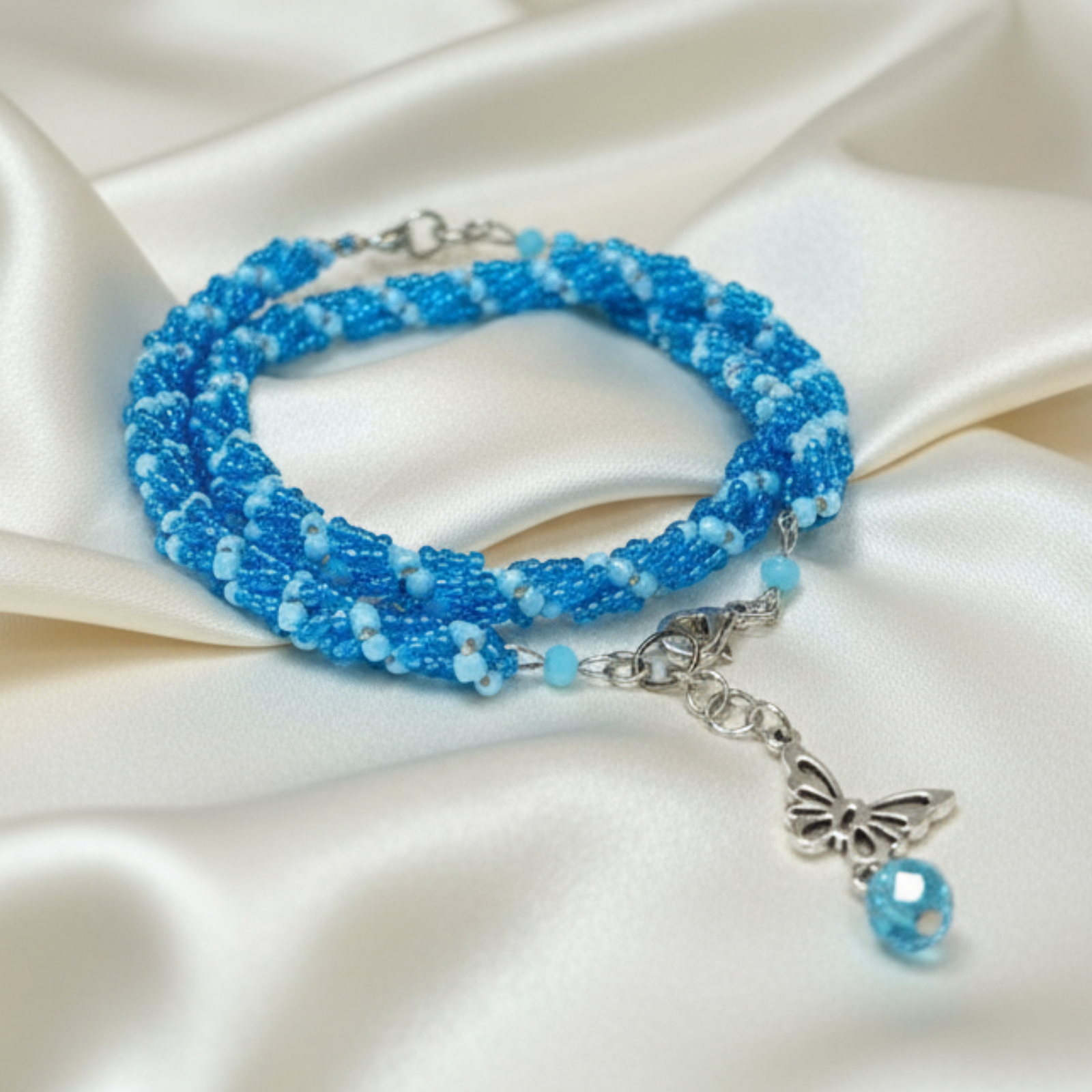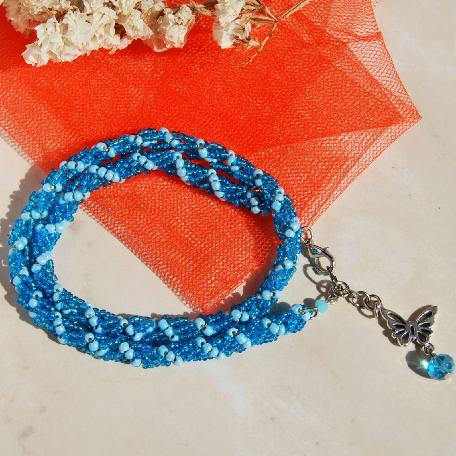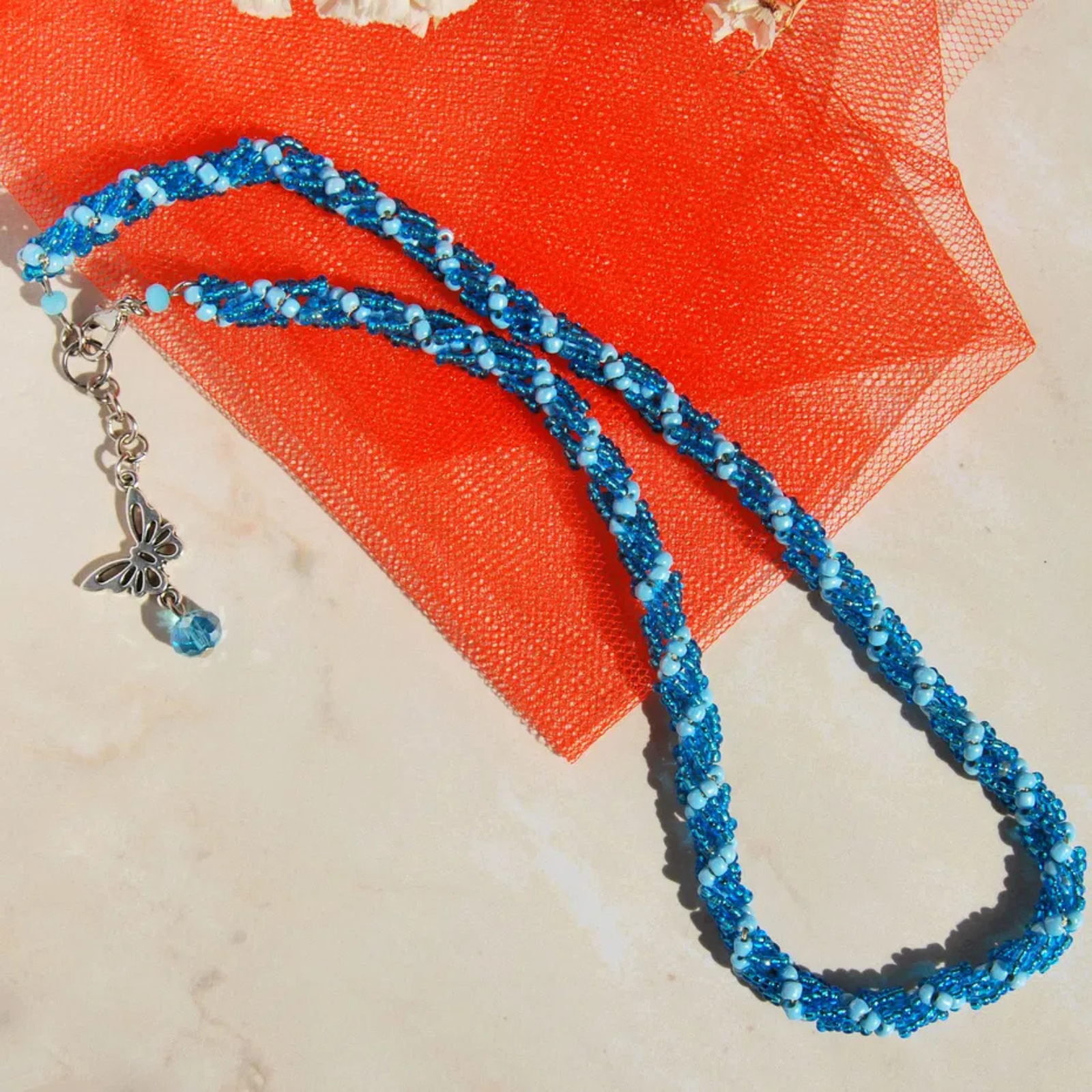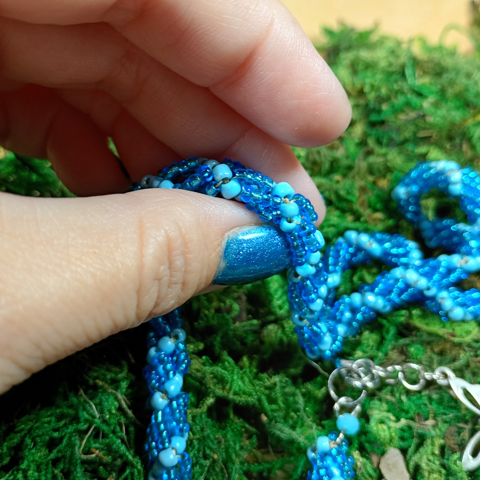 Rafinament, echilibru și un strop de senin — colierul Spirala Albastră de la Verdelysse este o bijuterie handmade creată cu migală și inspirație din formele armonioase ale naturii. Cusut manual, din mărgele de sticlă de dimensiuni diferite, colierul formează o spirală fluidă, elegantă, care prinde lumina în nuanțe de albastru intens.