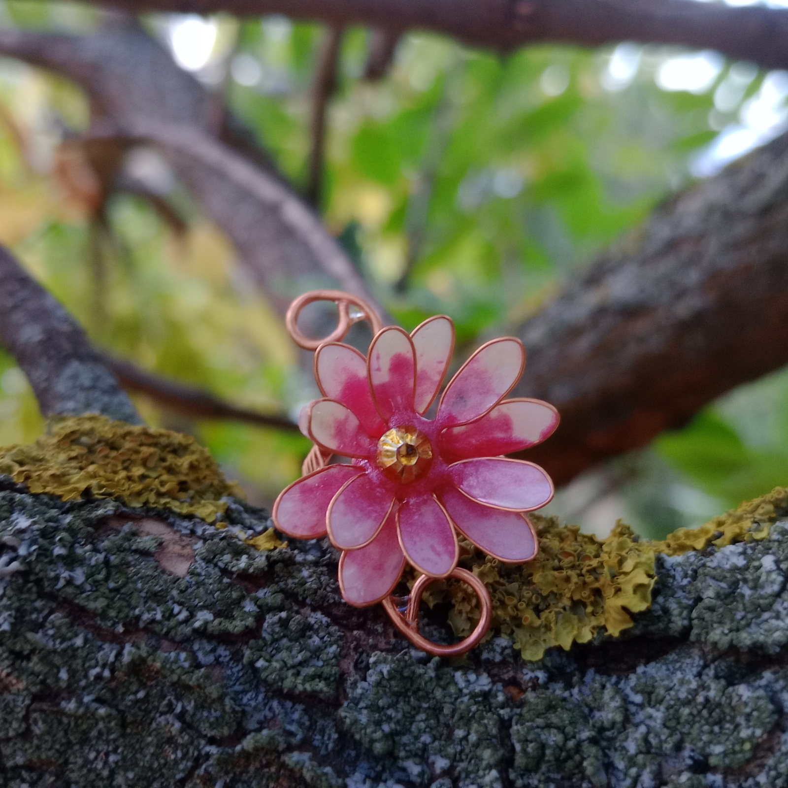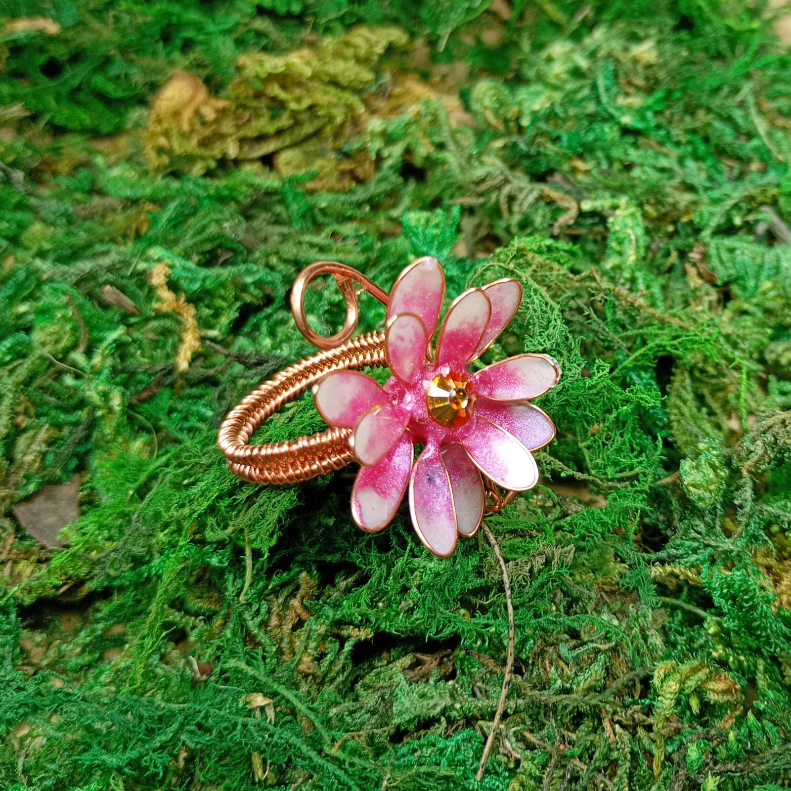 Inelul este lucrat manual din sârmă de cupru și rășină colorată cu pigmenți. Fiecare floare este turnată și finisată individual, rezultând o piesă unică.