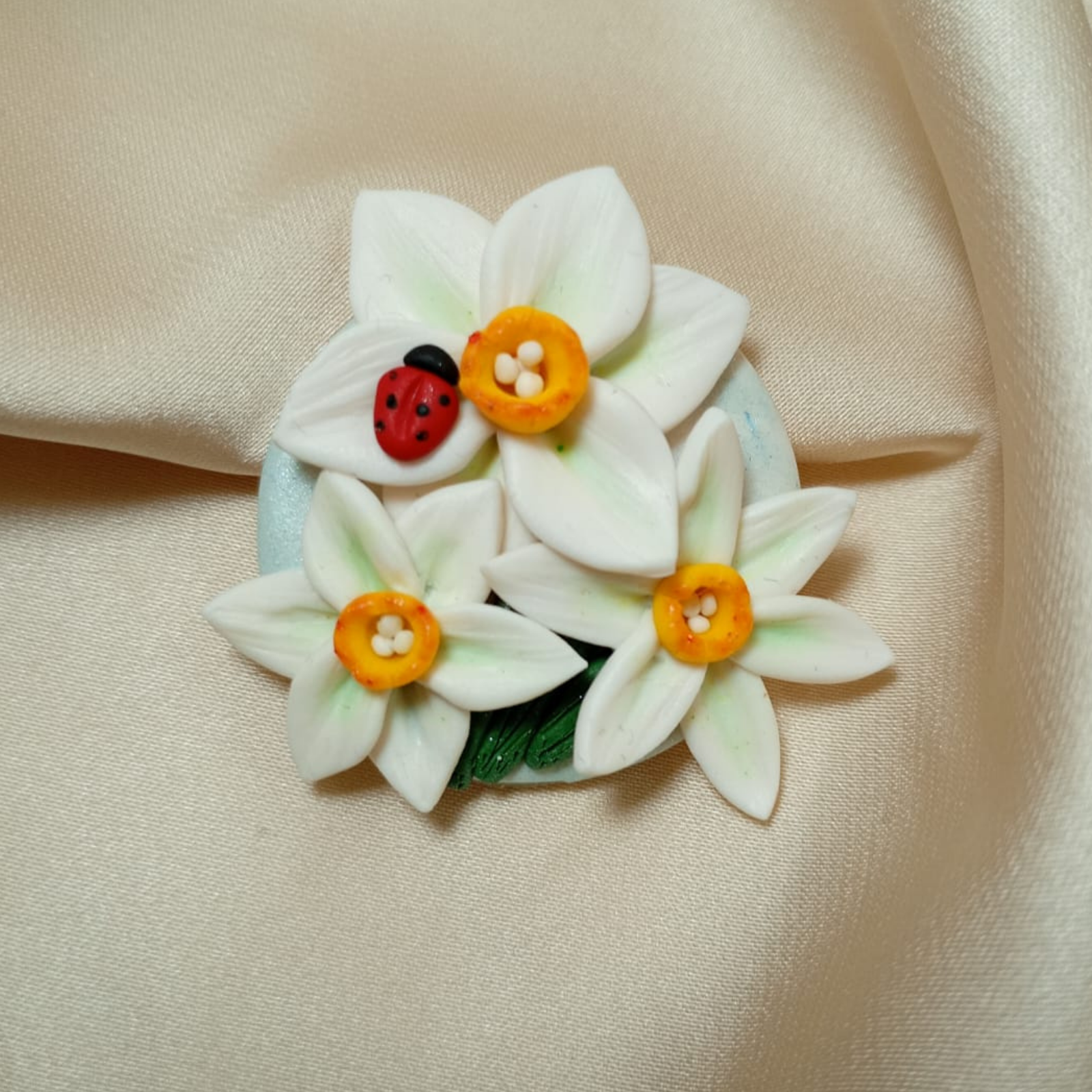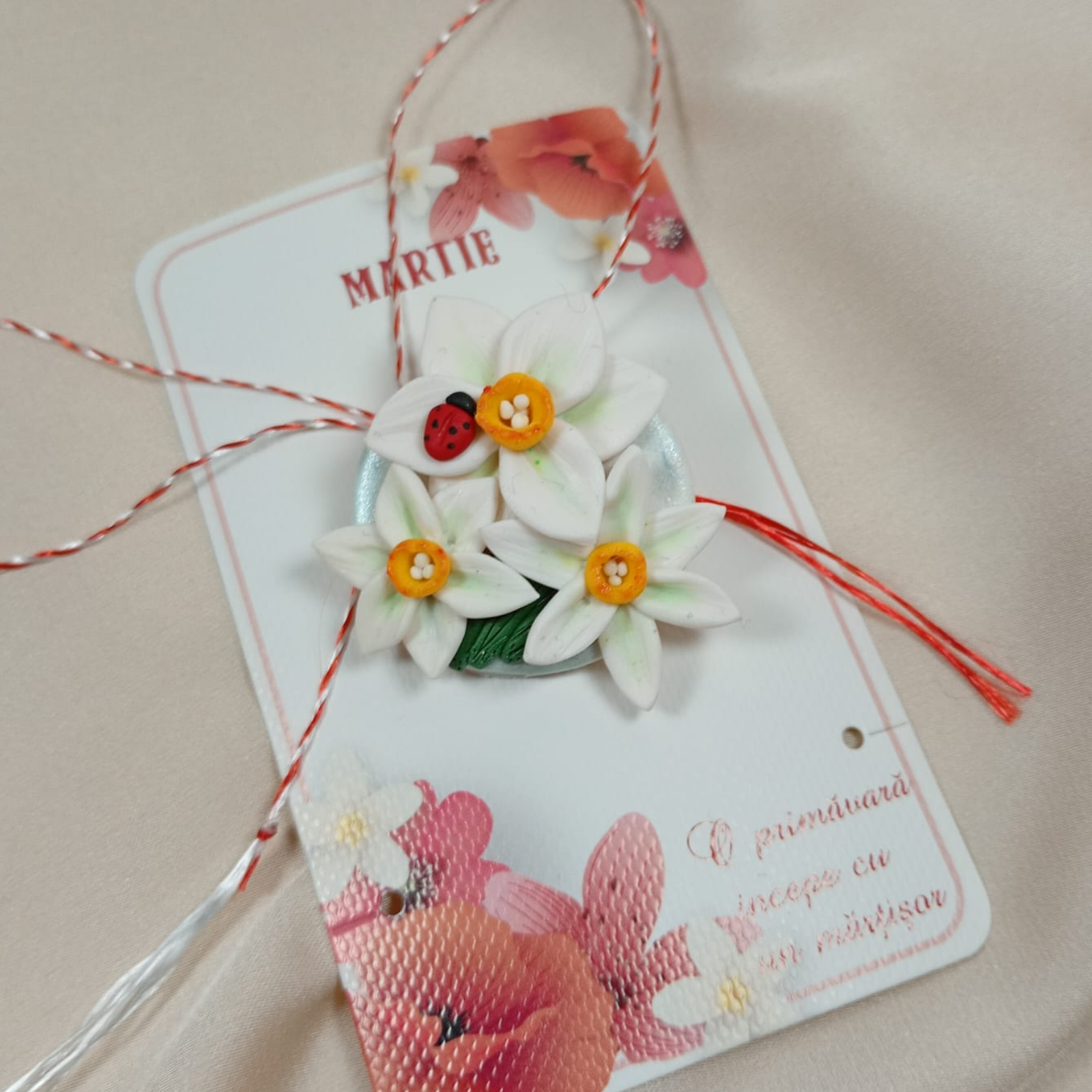 Mărțișor brosa modelat manual din argilă polimerică, cu narcise albe și buburuze roșii. Dimensiuni 3,4 x 3,6 cm, greutate 5 g. Livrat cu carton și șnur tradițional.