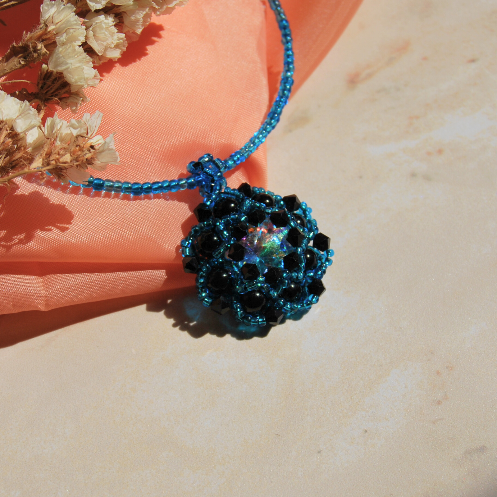 Pandantivul este lucrat din cristale biconice de sticlă, sfere și mărgele de sticlă, având în centru un cabochon din cristal acrilic cu efect irizat.