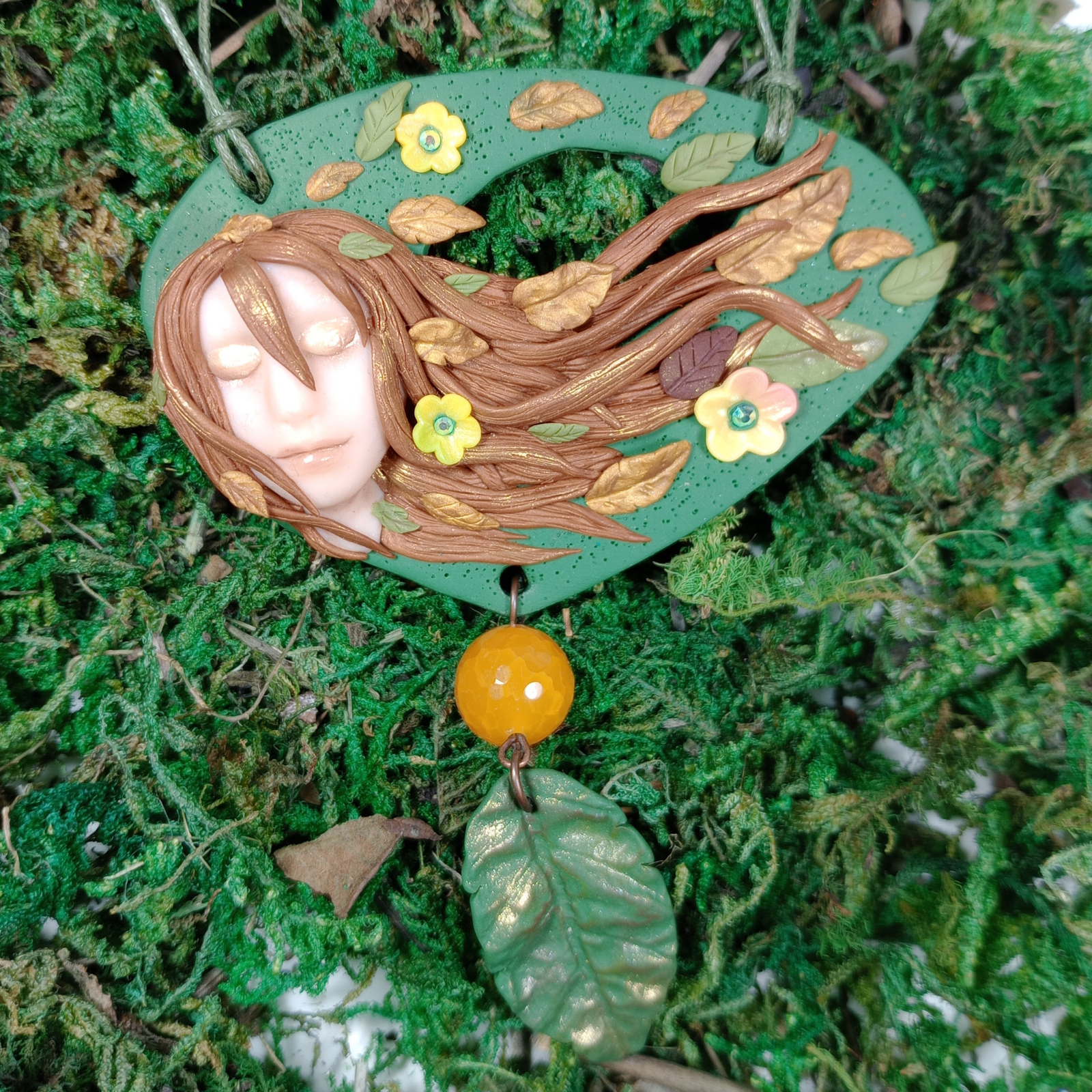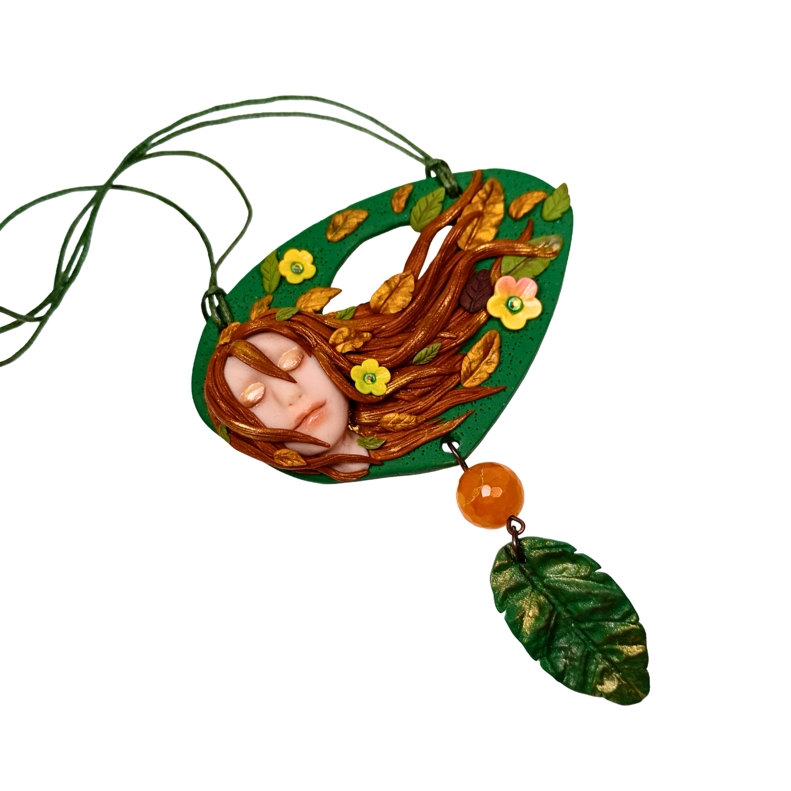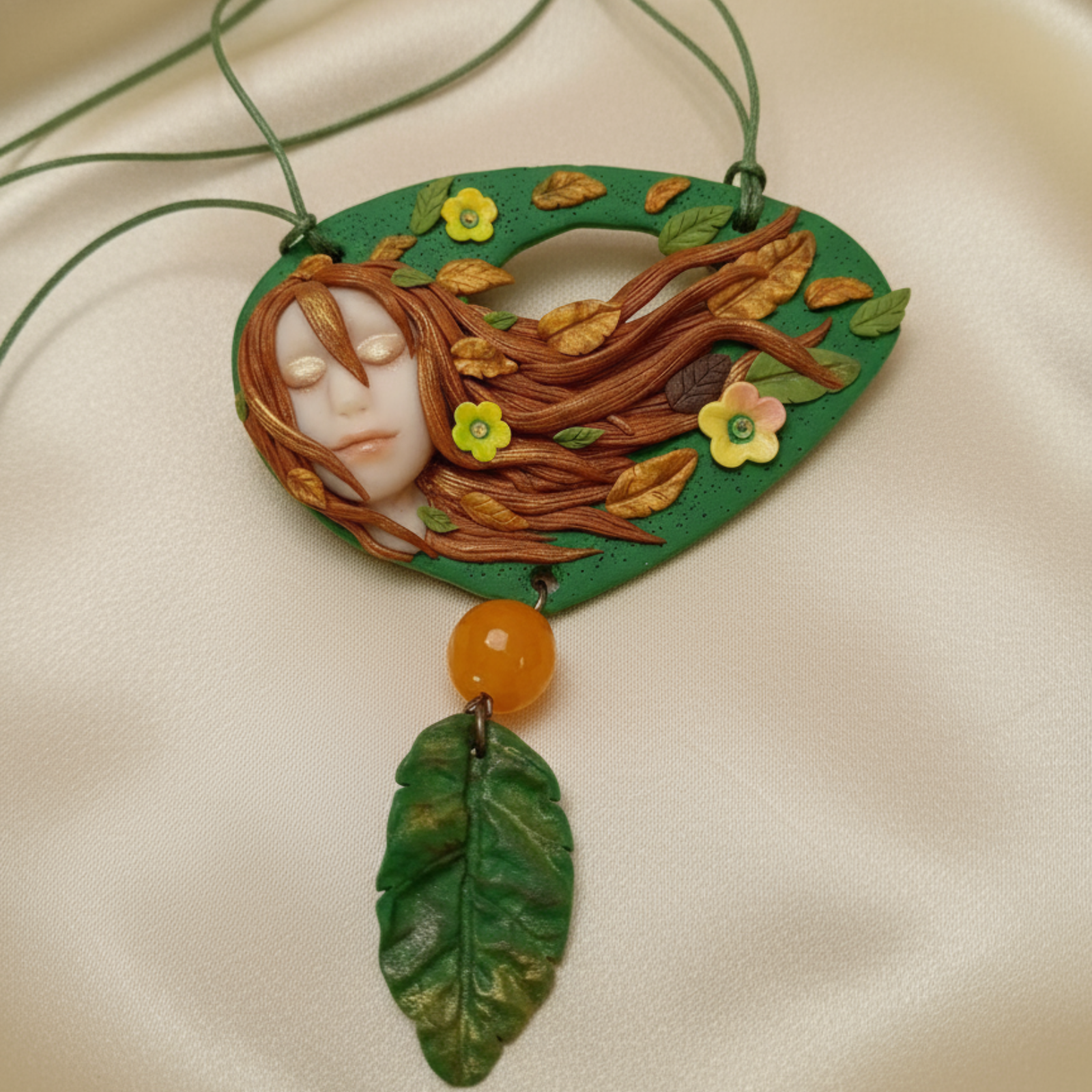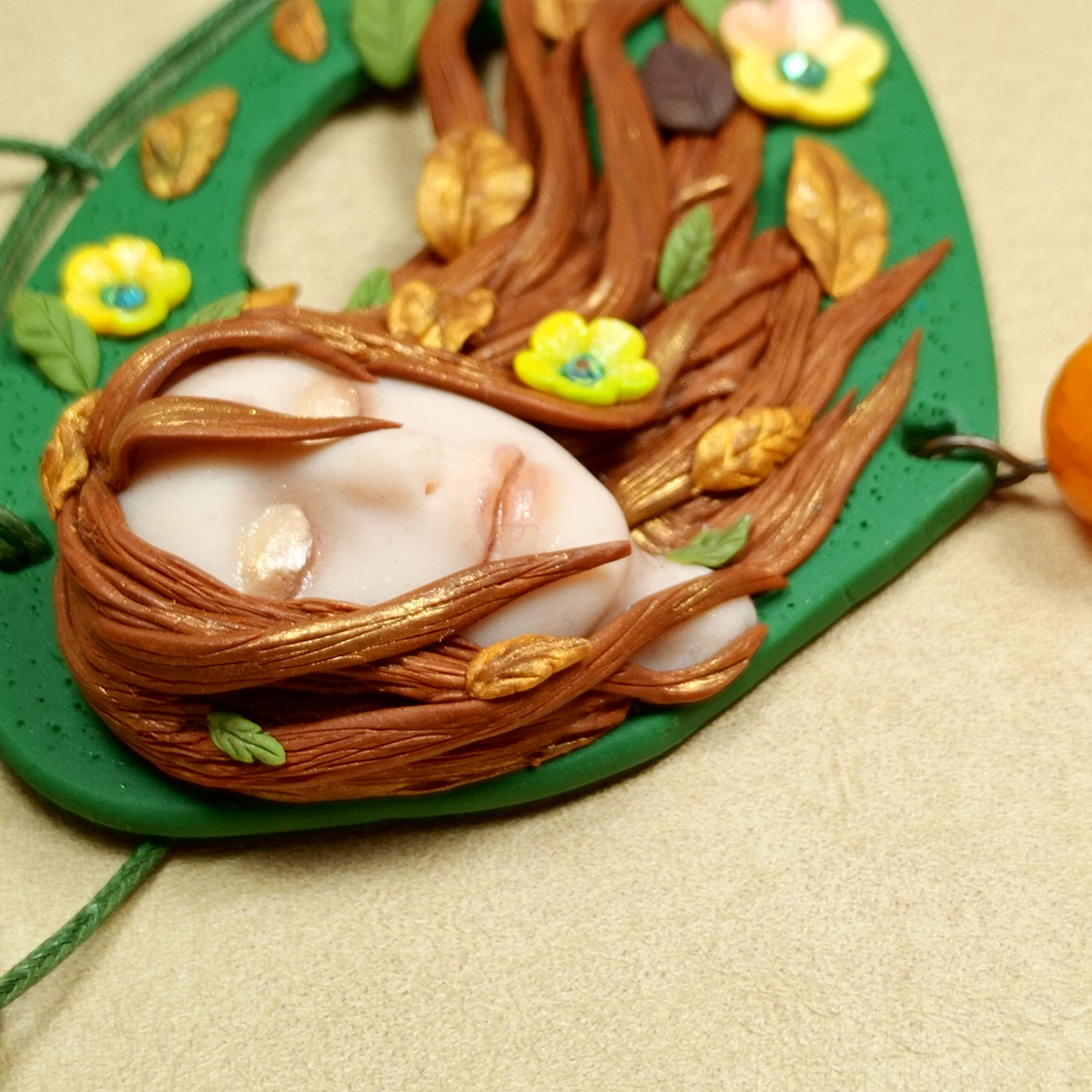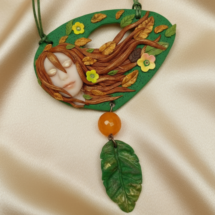 Realizat manual din argilă polimerică, acest pandantiv o înfățișează pe Toamnă sub forma unei zâne blânde, care îmbracă natura în culori calde și luminoase. Chipul delicat al zânei este învăluit în șuvițe bogate de păr brun auriu, împodobite cu frunze și flori galbene, iar o mărgea din agat galben completează compoziția ca o picătură de soare.