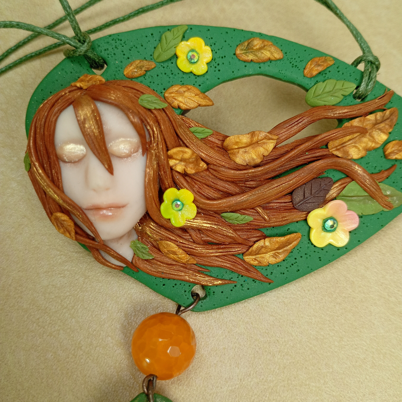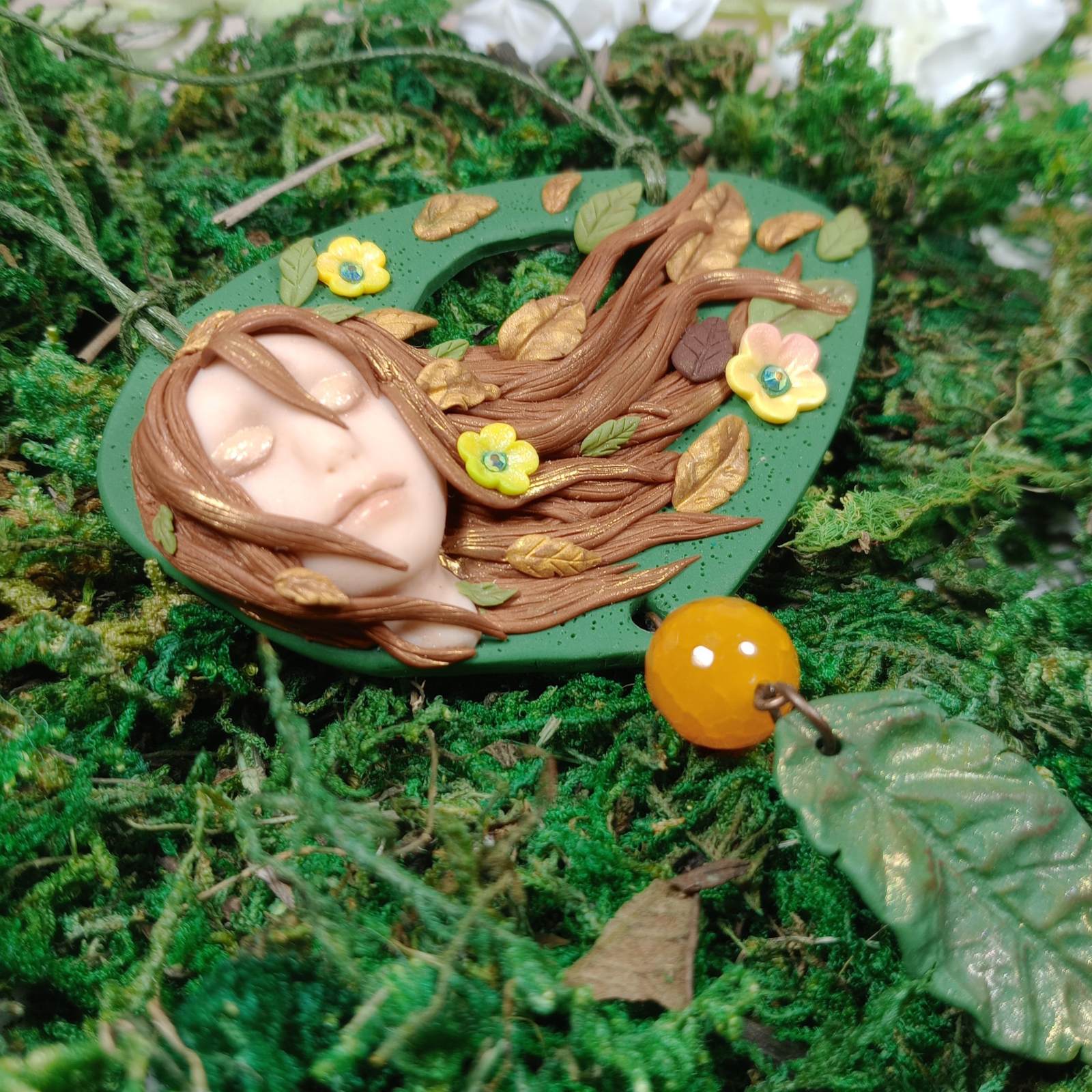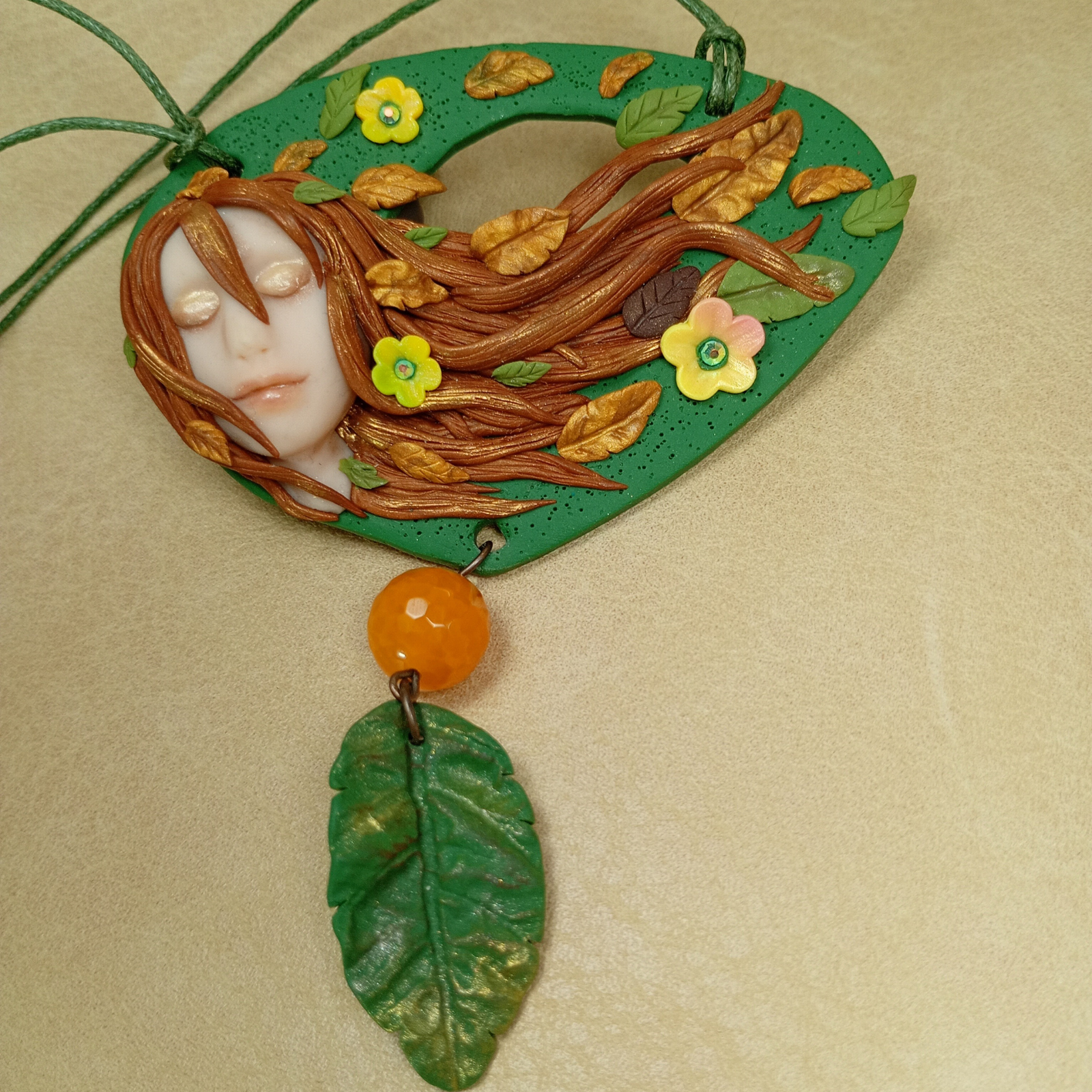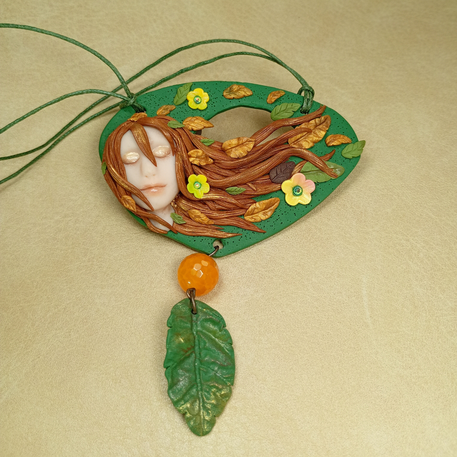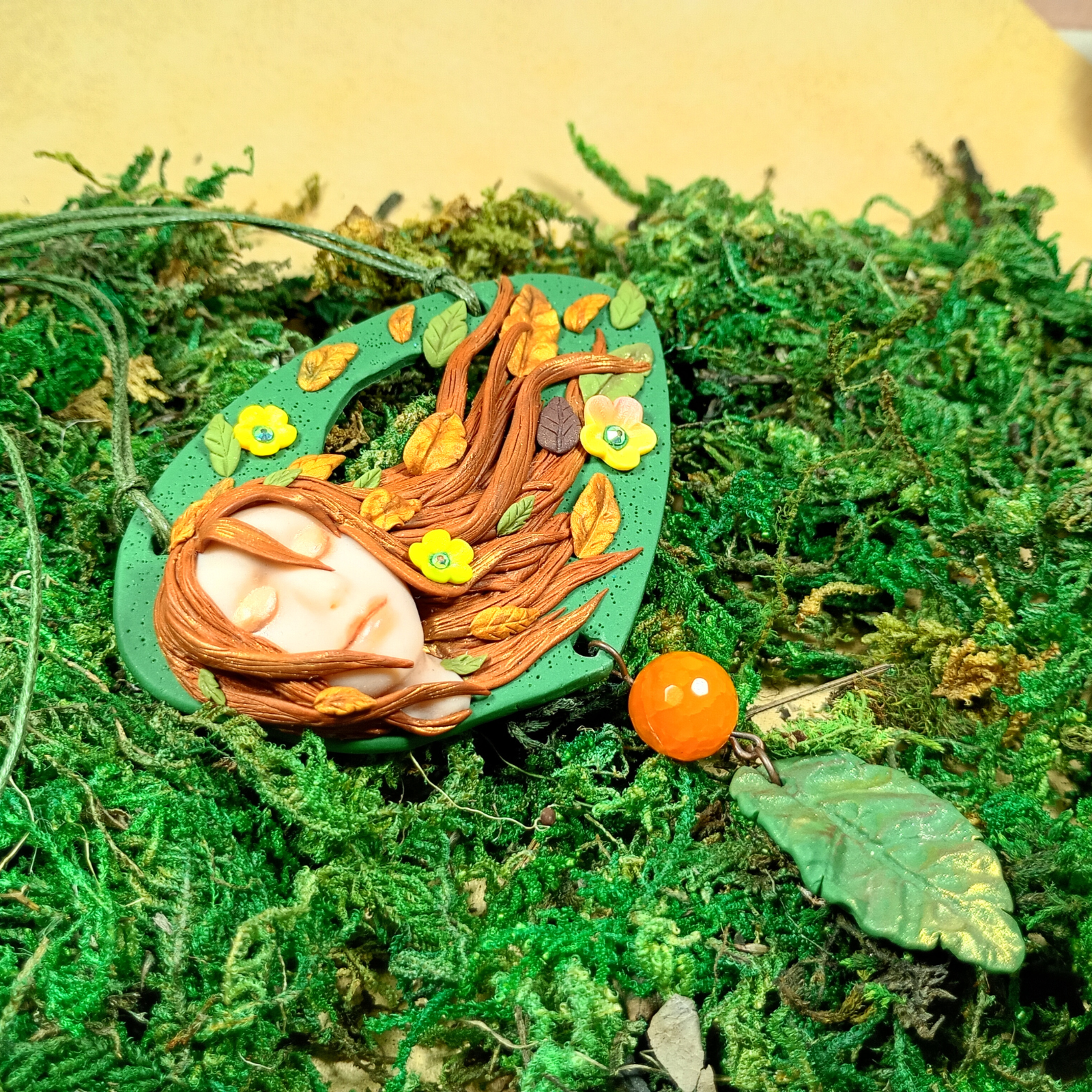 Realizat manual din argilă polimerică, acest pandantiv o înfățișează pe Toamnă sub forma unei zâne blânde, care îmbracă natura în culori calde și luminoase. Chipul delicat al zânei este învăluit în șuvițe bogate de păr brun auriu, împodobite cu frunze și flori galbene, iar o mărgea din agat galben completează compoziția ca o picătură de soare.