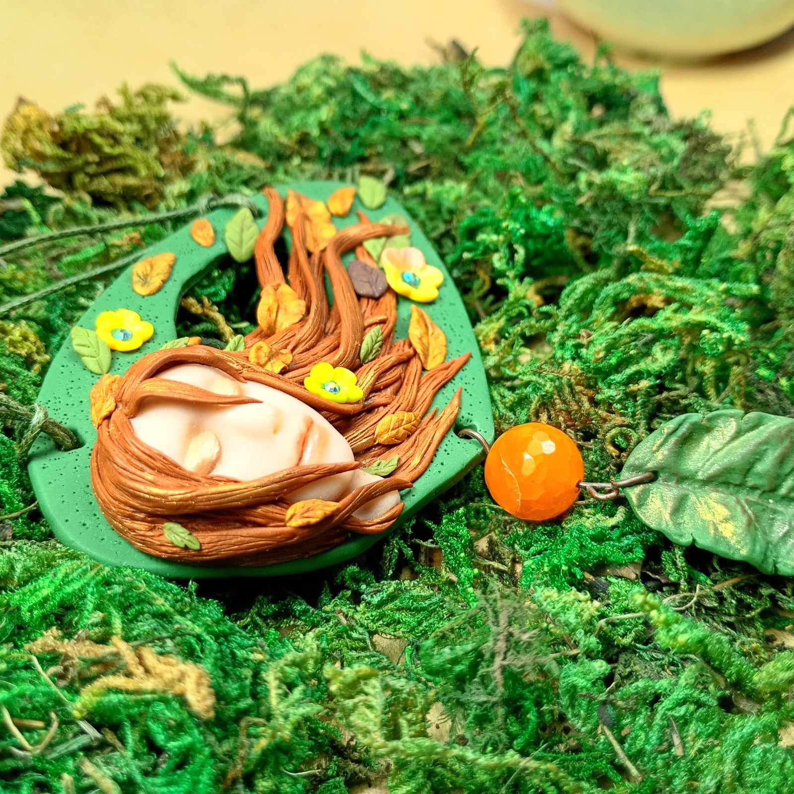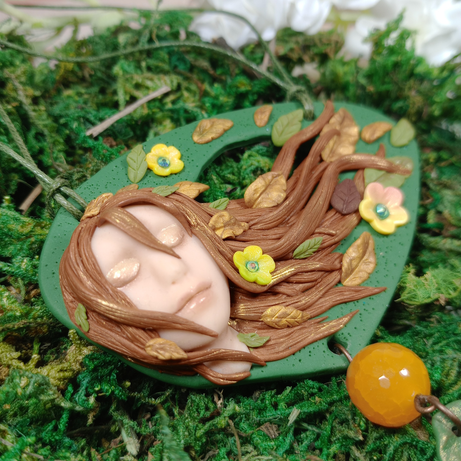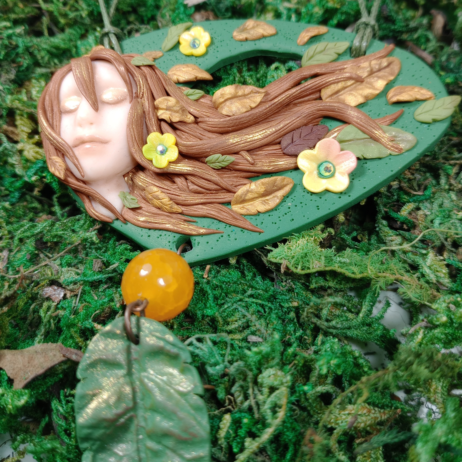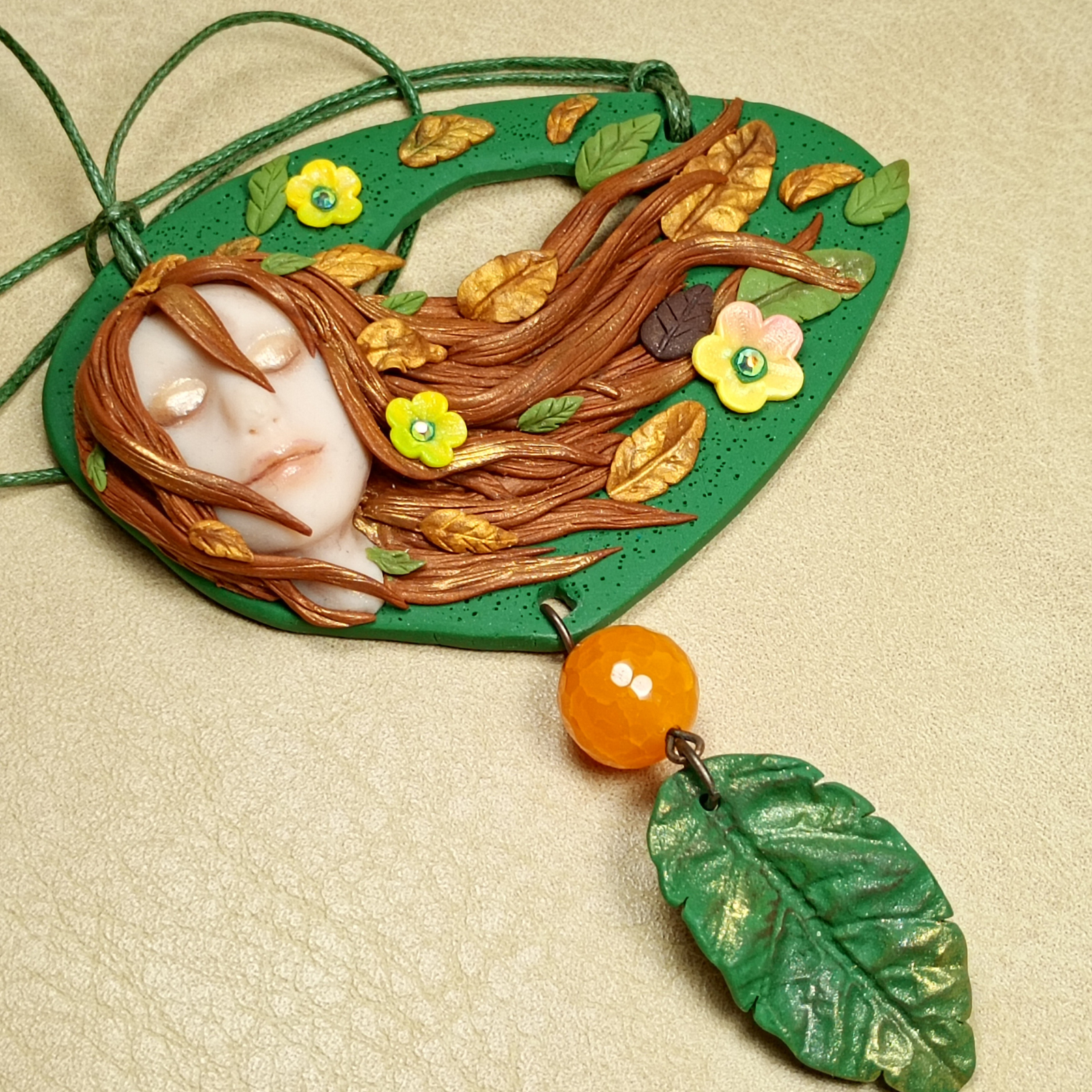 Realizat manual din argilă polimerică, acest pandantiv o înfățișează pe Toamnă sub forma unei zâne blânde, care îmbracă natura în culori calde și luminoase. Chipul delicat al zânei este învăluit în șuvițe bogate de păr brun auriu, împodobite cu frunze și flori galbene, iar o mărgea din agat galben completează compoziția ca o picătură de soare.