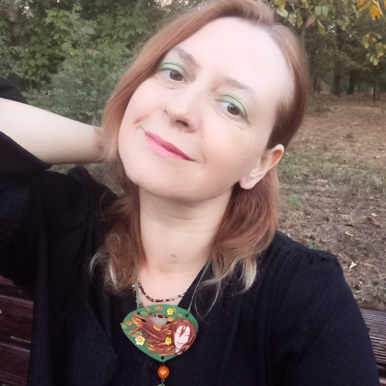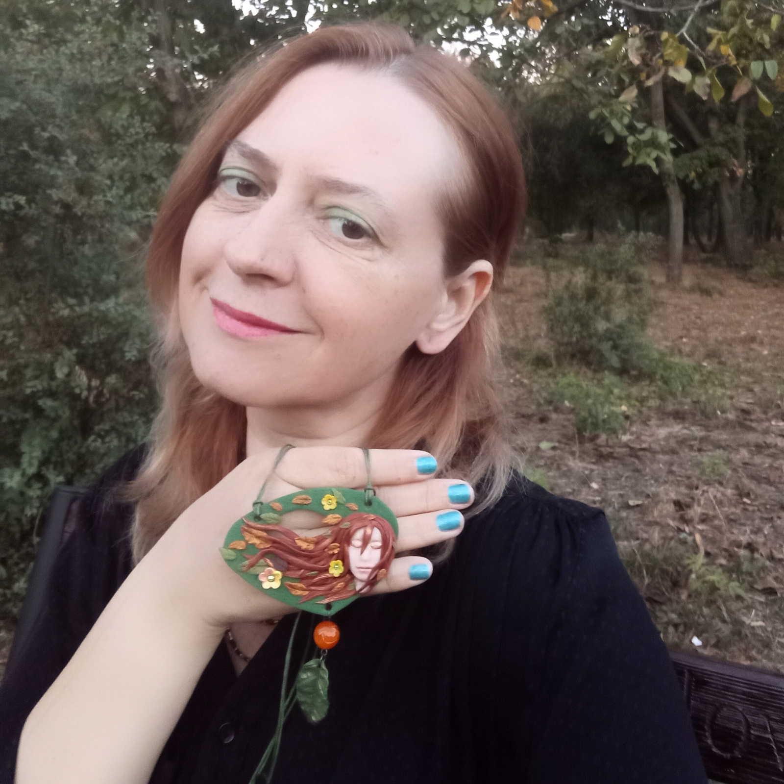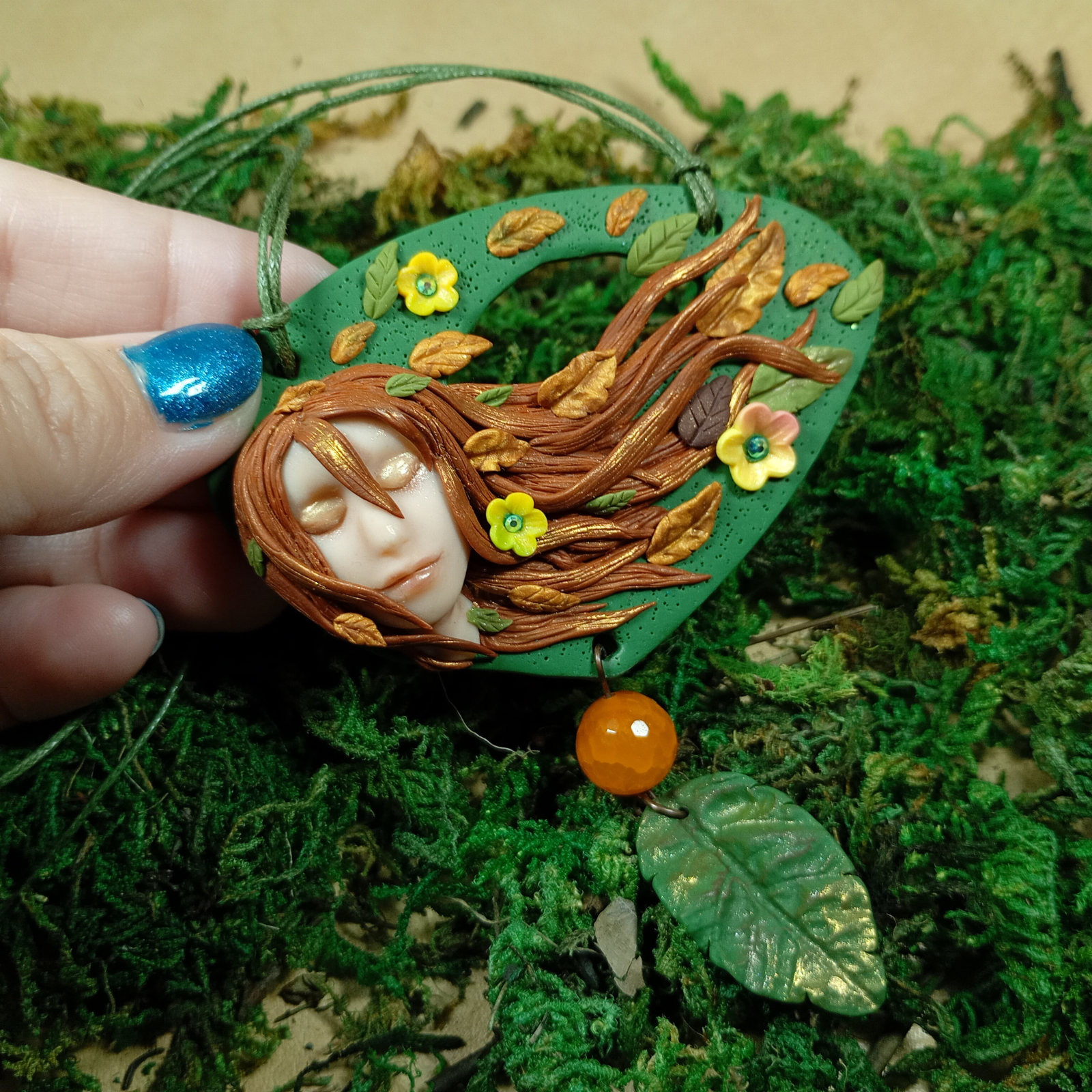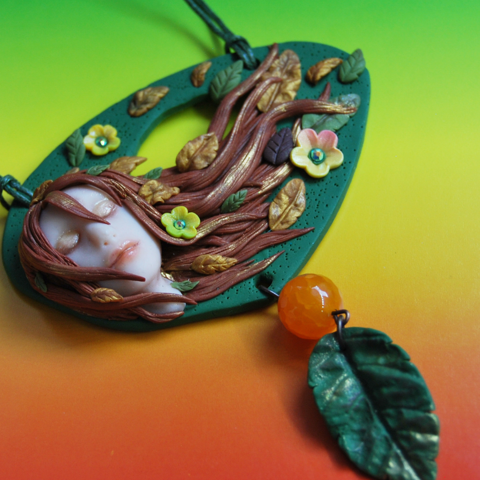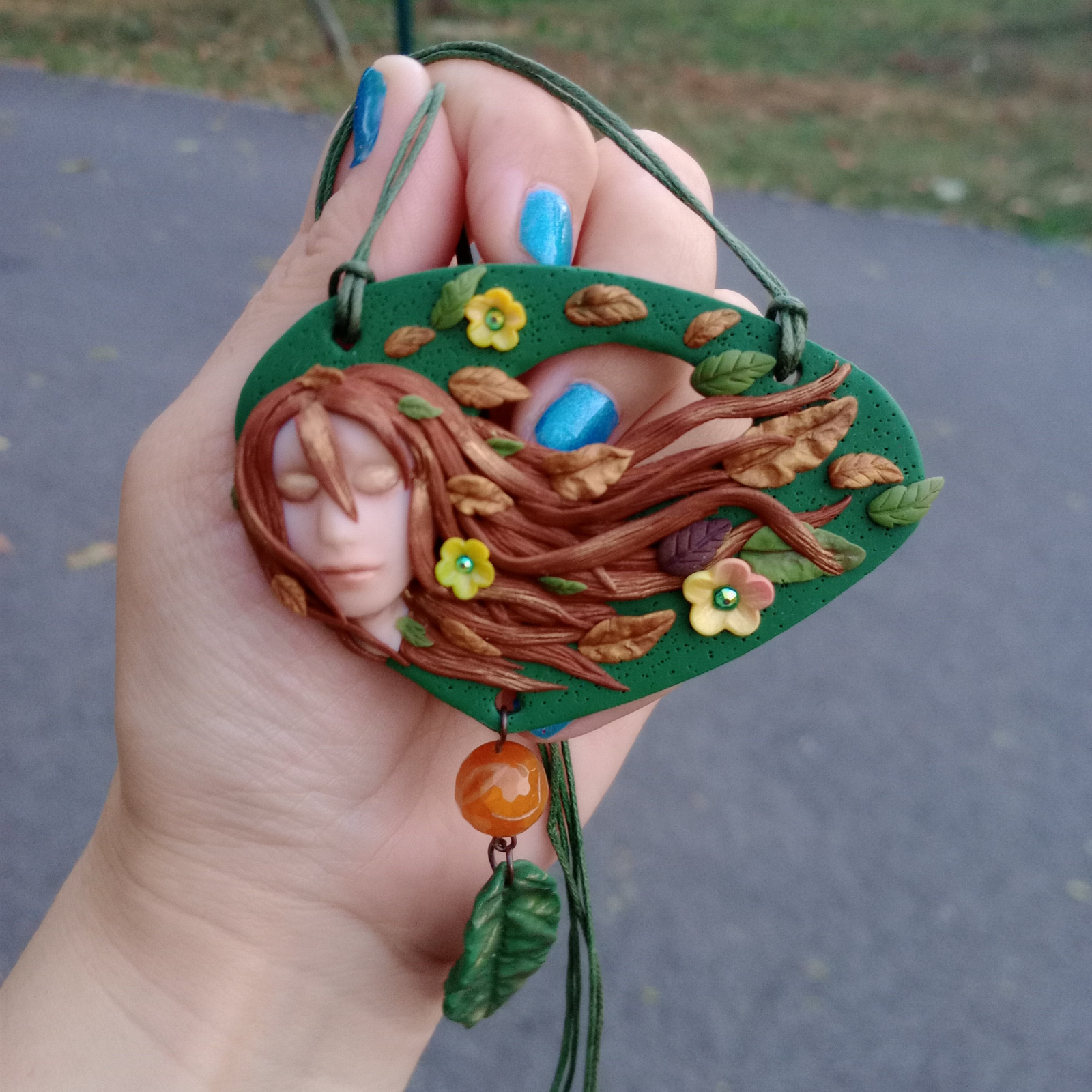 Realizat manual din argilă polimerică, acest pandantiv o înfățișează pe Toamnă sub forma unei zâne blânde, care îmbracă natura în culori calde și luminoase. Chipul delicat al zânei este învăluit în șuvițe bogate de păr brun auriu, împodobite cu frunze și flori galbene, iar o mărgea din agat galben completează compoziția ca o picătură de soare.