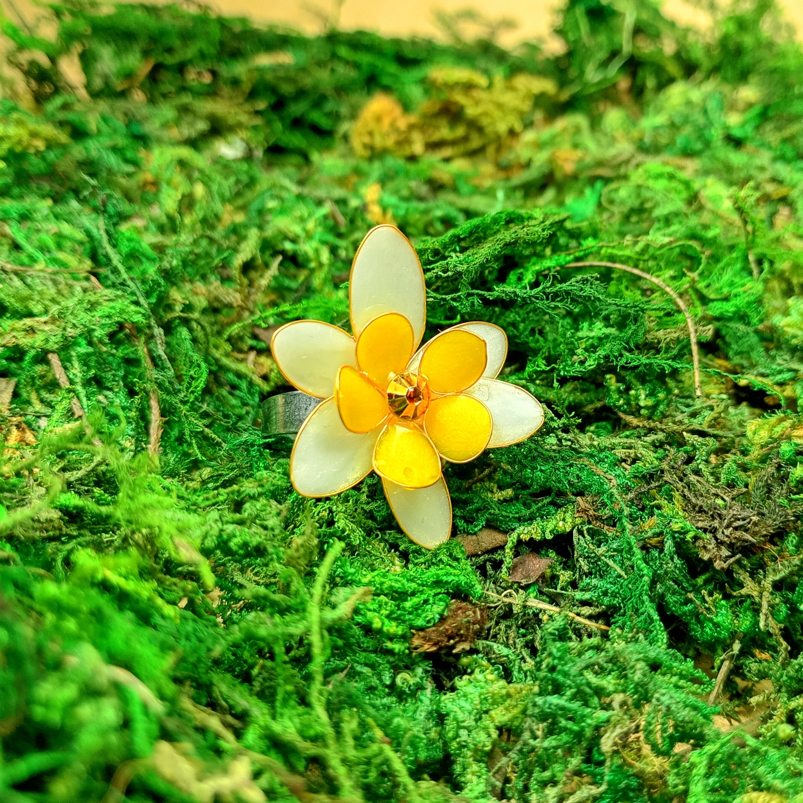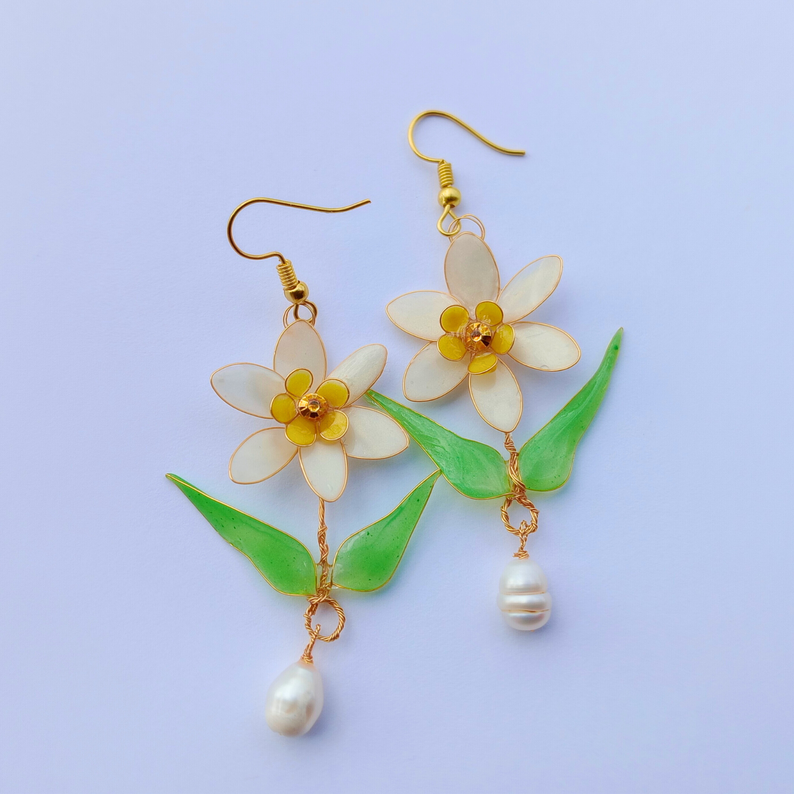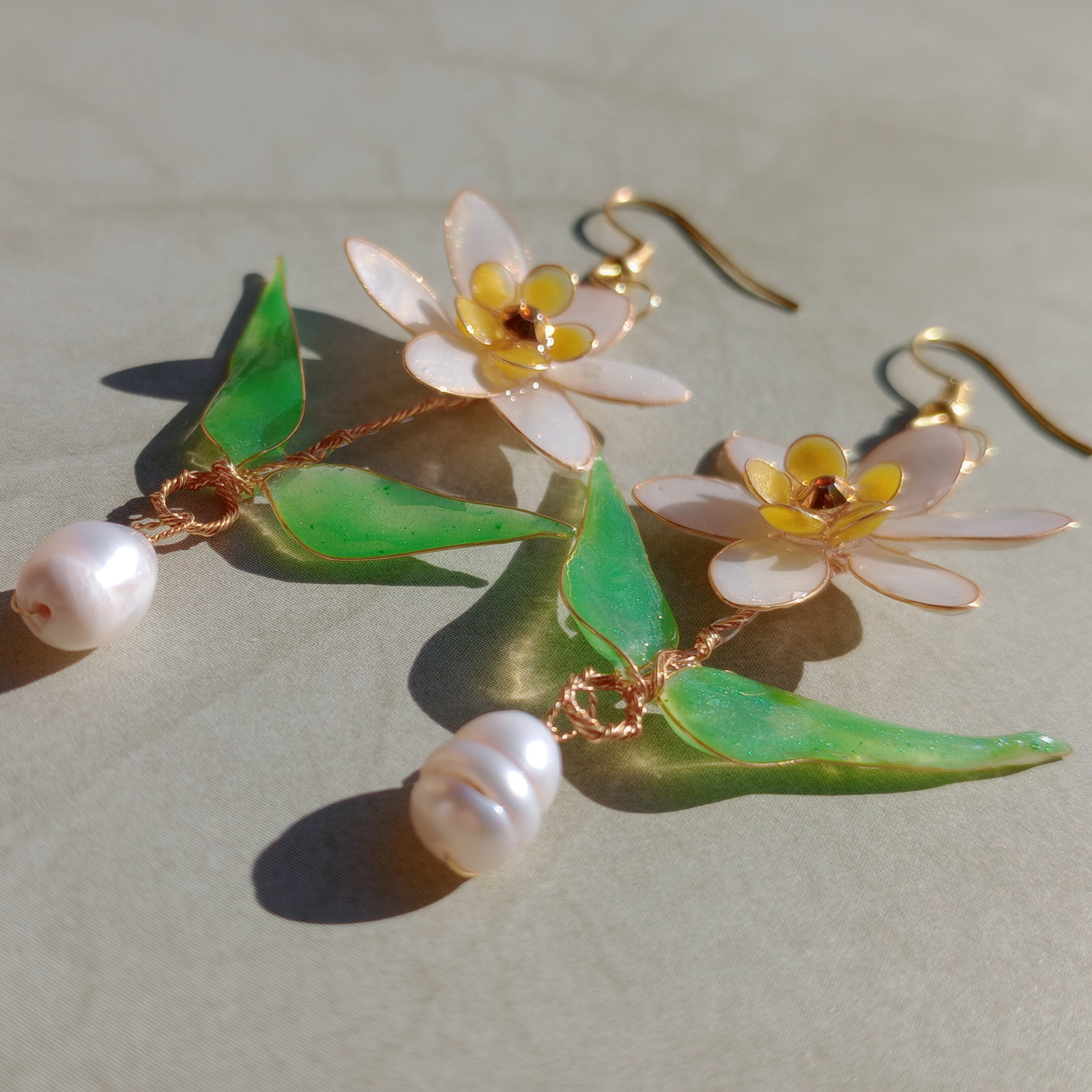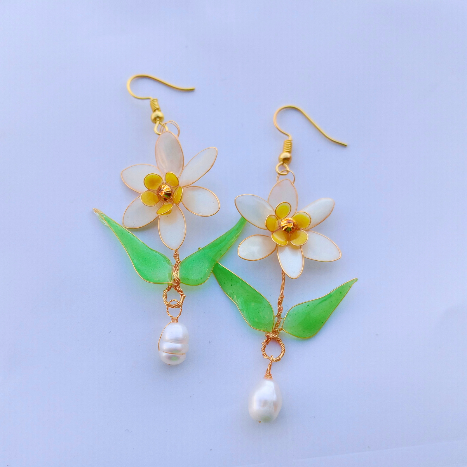Un set elegant și rafinat, realizat manual, format din cercei lungi și inel reglabil, cu flori albe delicate. Fiecare piesă este modelată cu grijă din rășină și sârmă aurie (gilt wire), îmbogățită cu cristale și perle de cultură care reflectă lumina cu o strălucire fină.