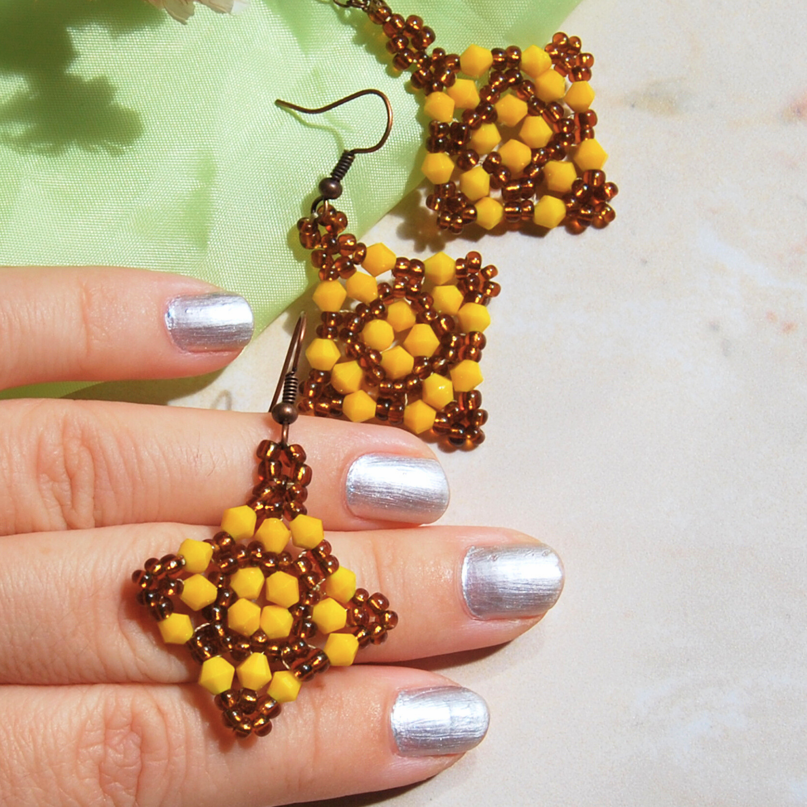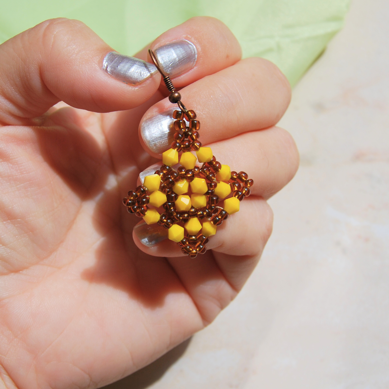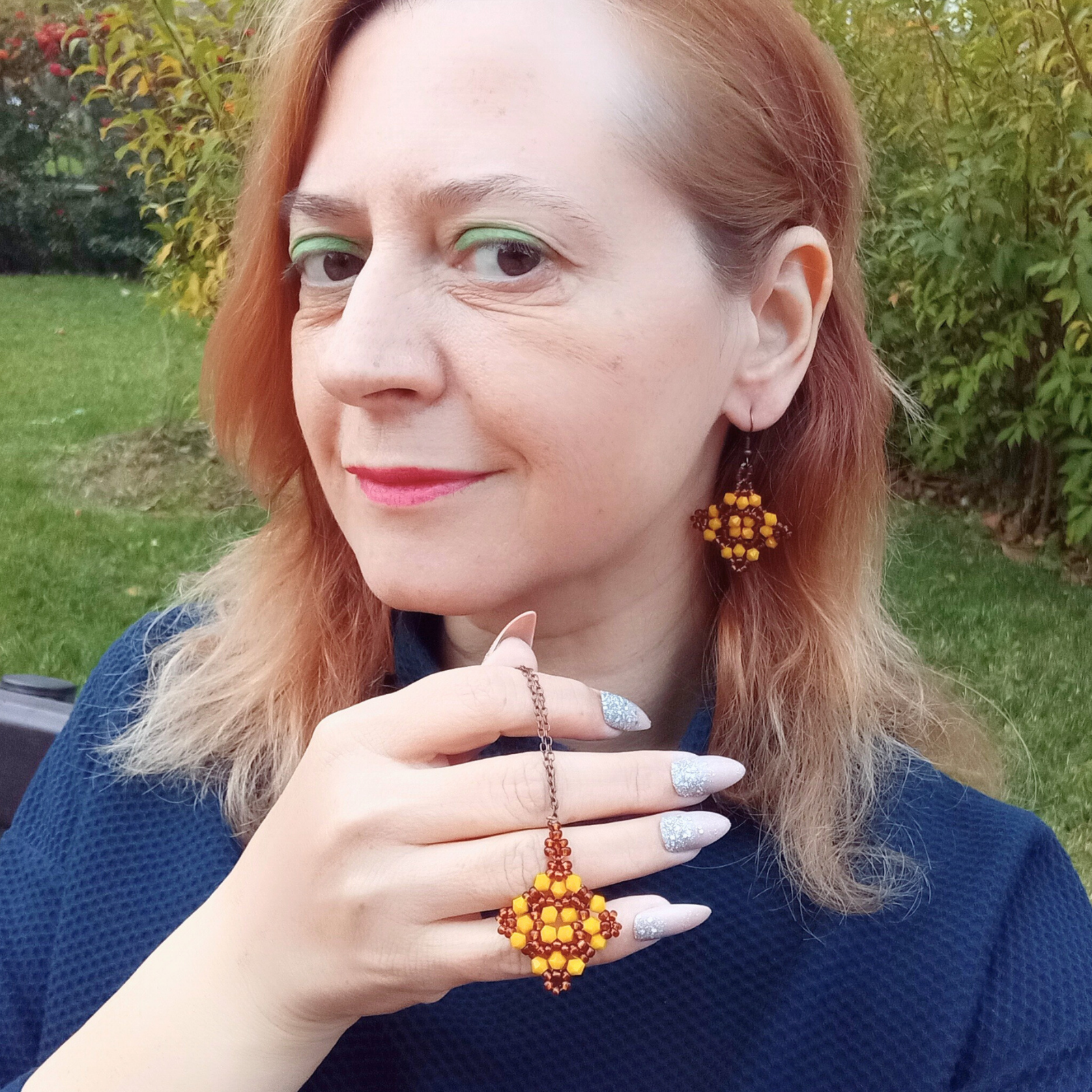 Evită alte bijuterii foarte colorate lângă față; poți adăuga cel mult o brățară discretă în ton de bronz sau cu mărgele mici galbene.