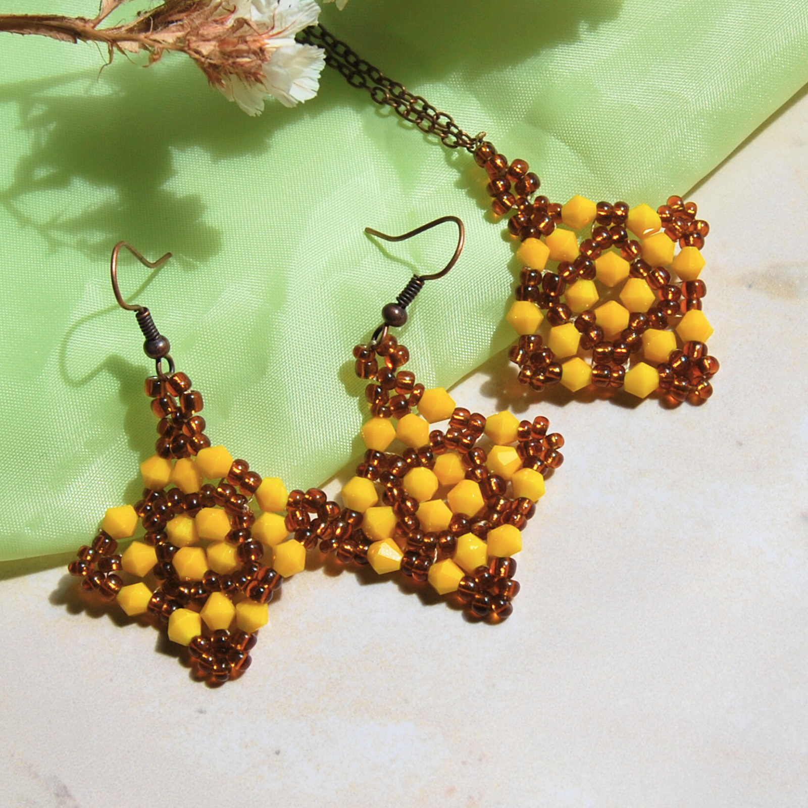 Setul este cusut manual din mărgele de sticlă și cristale biconice de sticlă, montate pe componente metalice tip tortițe și lanț.